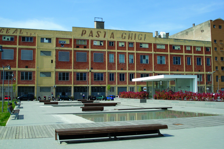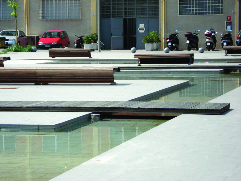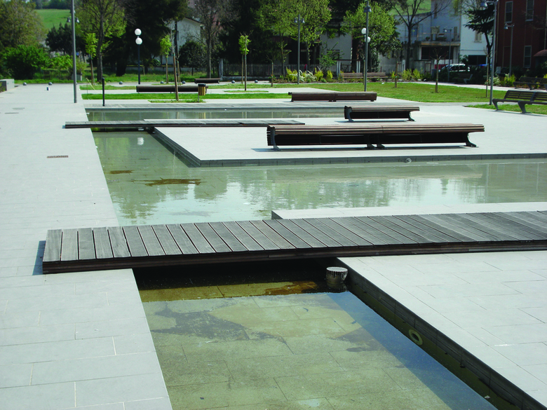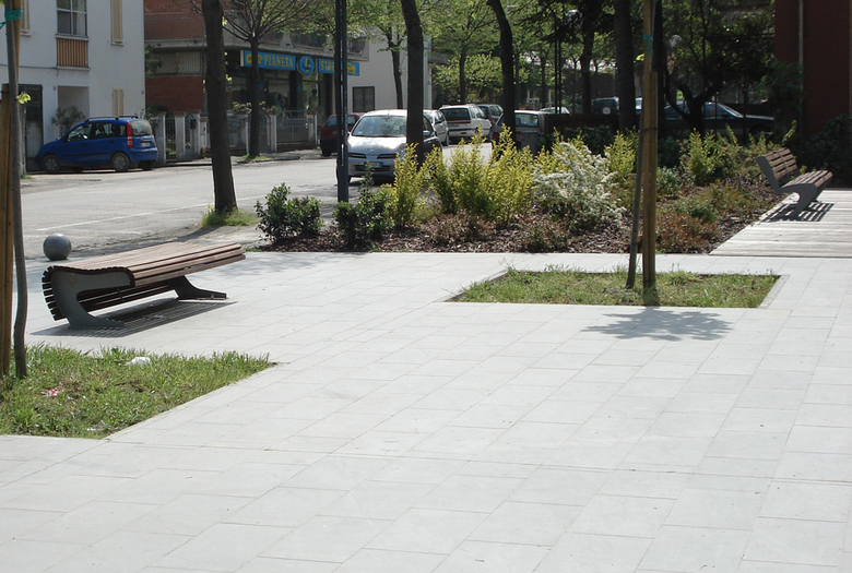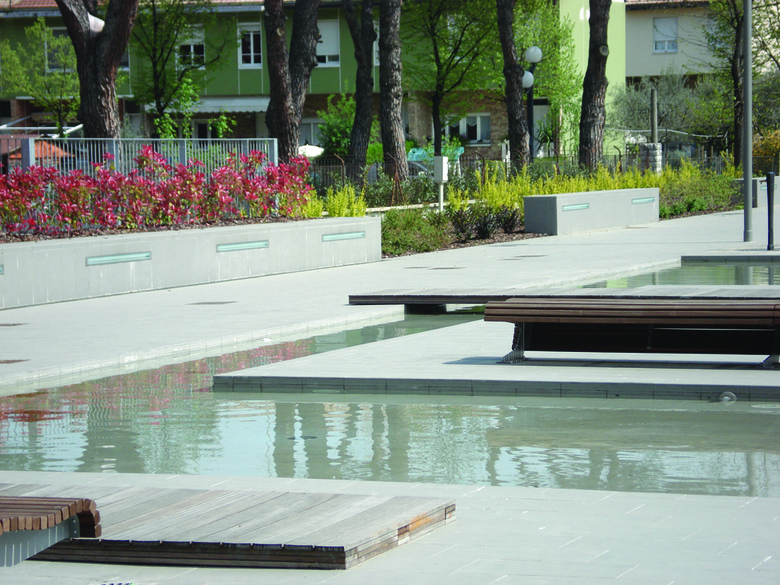 The public square and garden along the via Roma, in Morciano di Romagna (Rimini-Italy), is part of the works defined within the Urban Reclamation Plan for the complex which formerly hosted the Ghigi pasta-factory, located near the town centre. The project plans to convert the disused factory to new shops, houses and offices. The implementation of the proposal is based in two topics: - the will of linking the new filed to the urban compact pattern of the central area, featured by the spreading and continuity of the commercial system and by the continuos edification along the streets that end in the ex-factory’s area, where the town acquires the nature typical of the city-garden. - the possibility of “opening” the factpry, corssing it with a new pedestrian axis that would join the historical centre, the Marecchia river park and the natural context of the sorrounding hills. In the frame of the Urban Reclamation Plan, a wide part along the via Roma has been destinated to a subterranean parking area and a square/garden crossed by the pedestrian axis. The vegetation defines walls that divide the square from the adjacent spaces (private gardens and parking areas), vice versa the square contours are open by the entrance from the urban streets, to create a more closed and intimate space but fluently related with the surrounding context. The square (which covers the underground parking) is created through a minor terrain-modelling, a slight tectonics, made up of stones, consisting of parts below and above the water level, similar to artificial banks. The garden starts where the parking architecture stops and the ground becomes natural soil, providing the vegetation with optimum conditions to grow. The layout of the square and garden is conceived as a cadenced succession of simple-shaped sectors running along the pedestrian path, characterized by different materials, textures and lights. Some sectors are sunny and dry, others are wet, others more are made up of simple grass with isolated trees and their shadows.