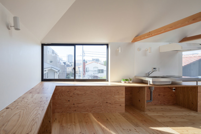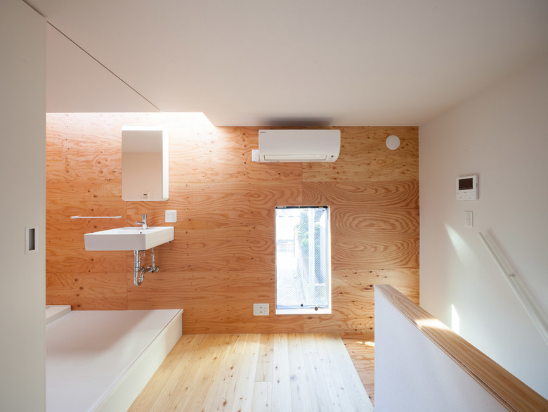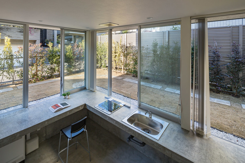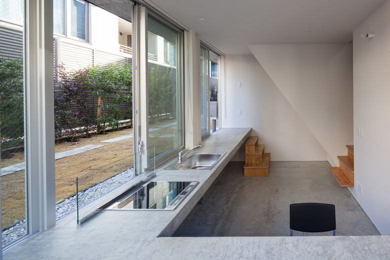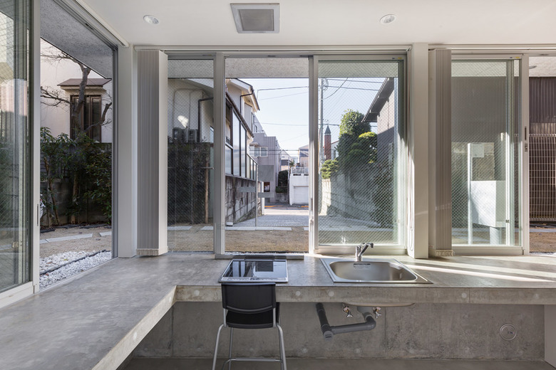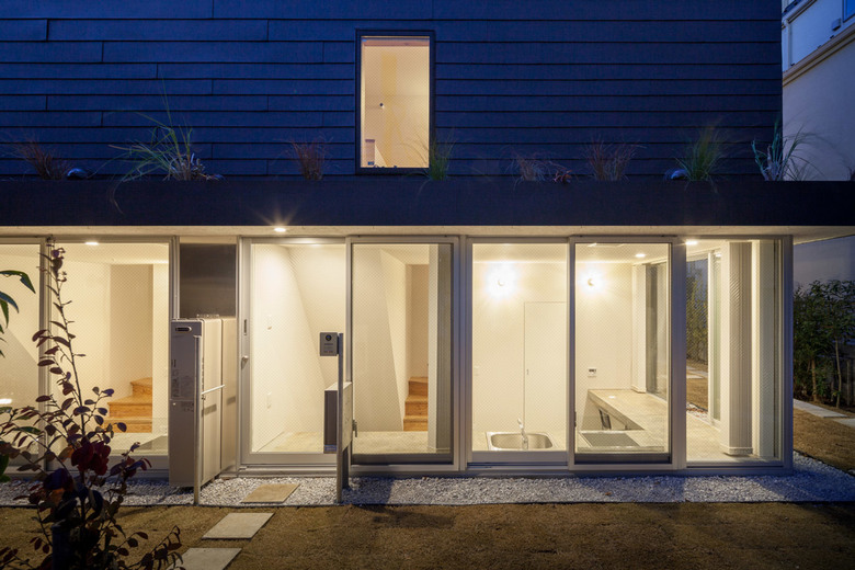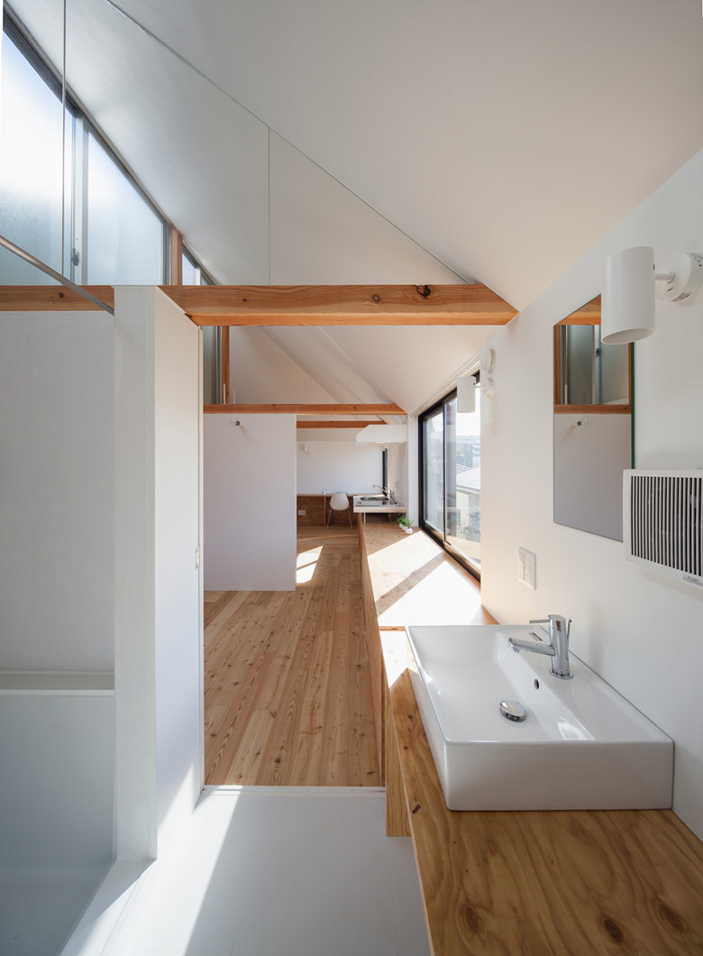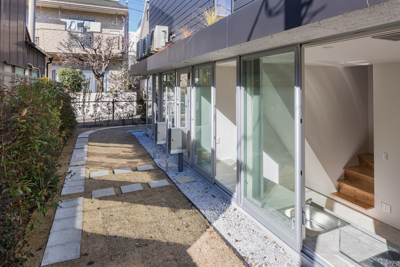 In order to keep the influence from the surroundings to a minimum and maintain a sustainable relationship, we decided to place the building in the center of the site and secure open spaces around it. The vacant land surrounding the building acts as the necessary pathway to each dwelling required by law for terraced houses. Furthermore, for example on the 1st floor, it also keeps the walkways at a distance from the building, creates an intermediary region under the eaves, lowers the internal floor level shifting the line of sight, creates a surrounding distance to the counter, and adjusts the relationship between inside and outside, all contributing to the appeal of the interior.