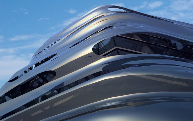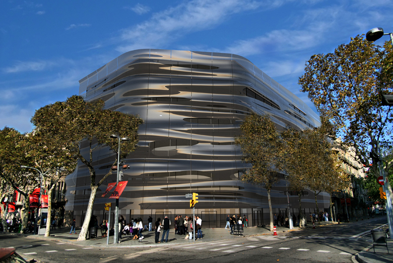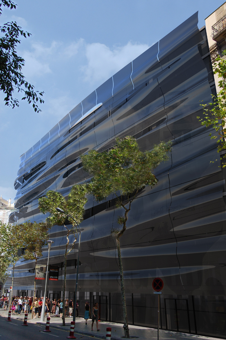 Axis Mundi eloquently captures the qualities of water—pristine, fluid, restlessly in motion—in its proposal for the Barcelona offices of H2O, a new bottled water company seeking to establish an innovative brand identity. The standard concrete structure of the existing building, just a stone’s throw from Gaudì’s masterpiece Casa Mila, is pierced with two elliptical voids that invite natural light into its core. An inventive brise-soleil, however, belies the building’s stationary mass and volume by mimicking the ripples of a pond. The team documented countless images of light on the flowing waters of rivers, streams and ponds, one of which was eventually made into 3D form using a phenolic composite material. This was cut and manipulated to create wave patterns that appear to ripple and rush impossibly around the building. This skin is suspended in front of the façade by organically shaped web trusses. “All water has perfect memory,” wrote author Toni Morrison, “and is forever trying to get back to where it was.” This exquisite building reminds us of the source from which we derive life.