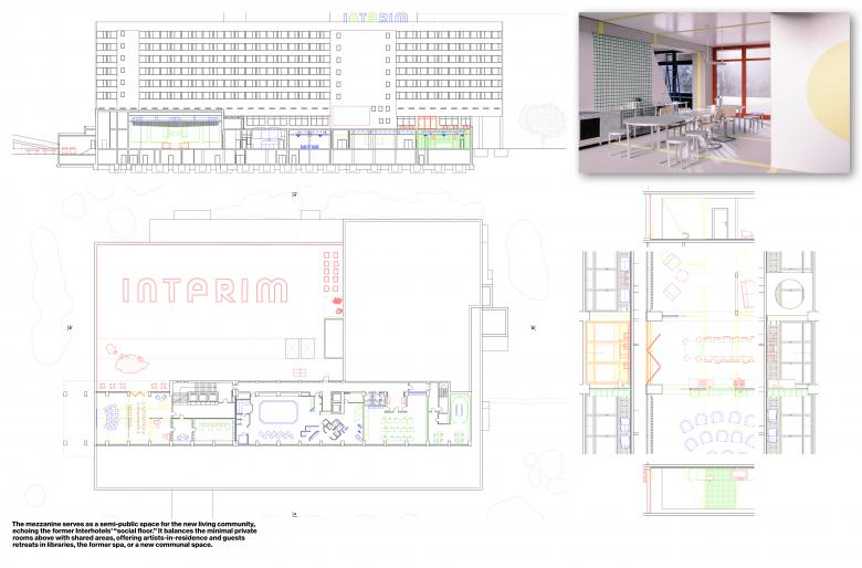 The proposed interim use integrates functions that address both the needs of Burg Giebichenstein University of Art and Design and the surrounding community. It includes studio spaces for students, temporarily fulfilling the role of the long-awaited new studio building. Additionally, the hotel becomes a social hub, housing a materials exchange (Bauteilbörse) for reclaimed building components, a neighborhood center, and a nightclub. The upper floors accommodate an artist residency program, supporting the university’s efforts to expand its cultural network. By repurposing the hotel, the project transforms a space in limbo into a vibrant, multifunctional site — offering an alternative to demolition while fostering artistic and social exchange.