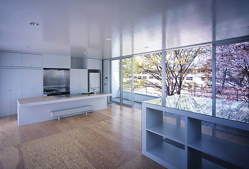 Scene-4 Second floor: The living room has terraces on the south and north sides. Through the long terrace window, residents can view the trees at branch height. Breezes enter through both side windows,. The finishing materials used on the terrace are the same as those used inside the house, increasing continuity between interior and exterior. The glossy ceiling reflects the trees, giving residents a sense of sitting among the branches, and in spring, of floating in the cherry blossoms.