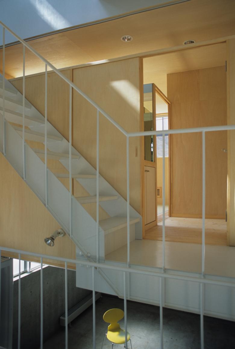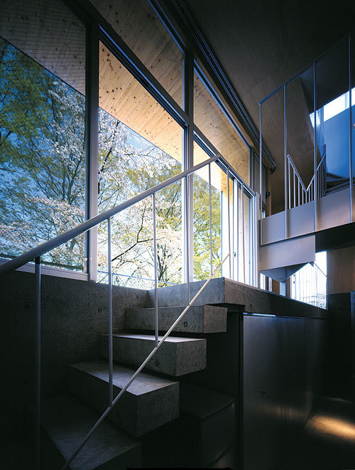 Each level is finished using different materials. The basement floor uses exposed concrete, the first floor wood, and the second floor white materials. The difference in the finishes strengthens the difference between levels. We used this as a device for increasing the residents’ consciousness of vertical movement and height so that they could better appreciate the cherry trees.