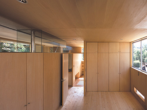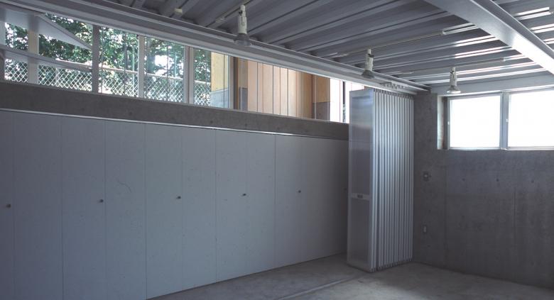 Scene-3 Private rooms on the first floor: These are a half-story above the entrance. The upper half of the exterior walls in these rooms are taken up by windows that run along the entire width of the house. These windows reveal a dense green belt, sharpening the residents’ awareness of the swaying leaves and the subtle changes in light and shade created by the trees.