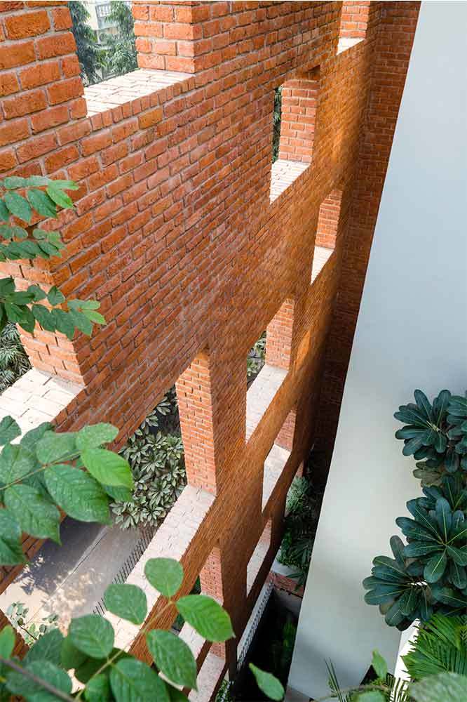 In keeping with a strong tradition of brick production in the region - the building was conceived as a brick masonry structure with a high thermal mass maximizing daylight and minimizing solar gain. A 345 mm thick “brick veil” wraps around the building - as a buffer between the home and the city - floating away from it at times to form intimate courtyards for light and ventilation.