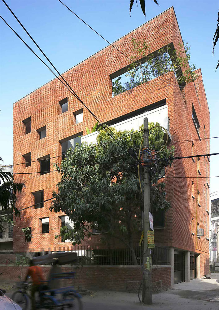 The geometry of openings in the brick veil is independent of the fenestration of each floor thus allowing a hit-and-miss line of sight through them - juggling privacy and framing views to the outside. Natural light and ventilation fill the building while screening residents from the heavy traffic nearby.