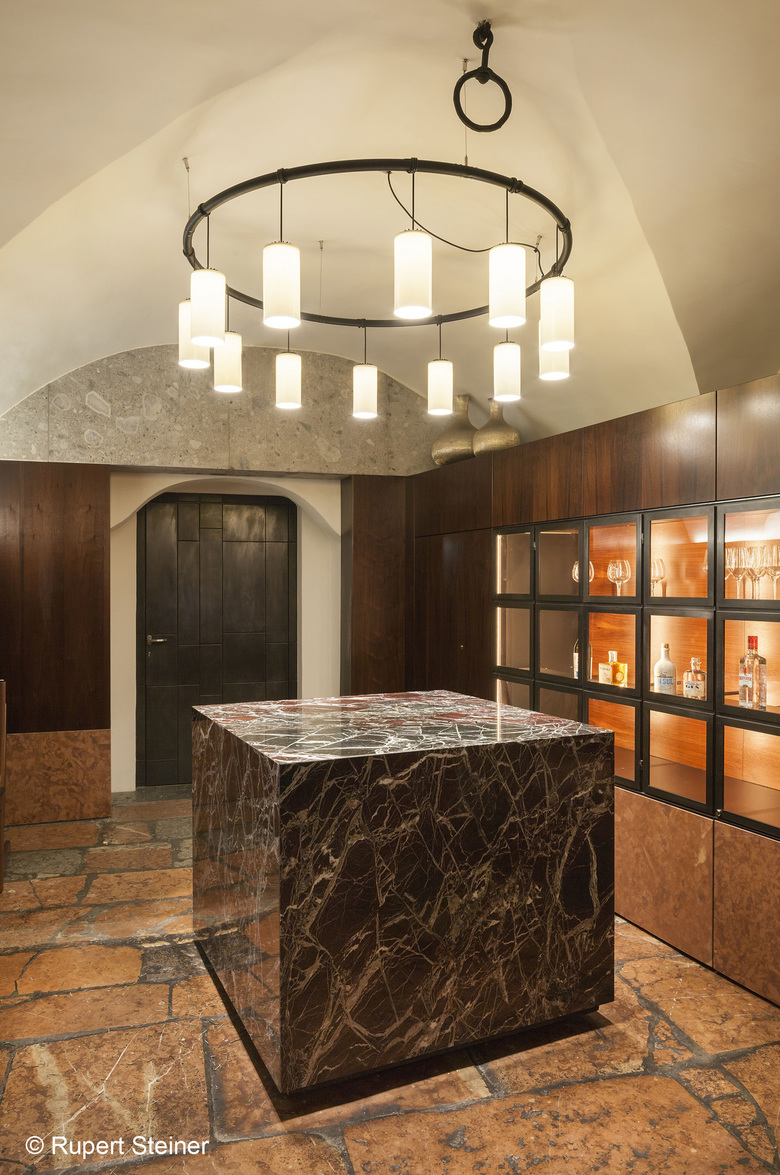 BEHF’s design concept for Koller + Koller am Waagplatz is characterised by a variety of materials and a lively, skilled craftsmanship from Salzburg, Styria and Lower Austria, incorporating metalworks and the use of high quality marble varieties and refined wooden components in traditional ways.