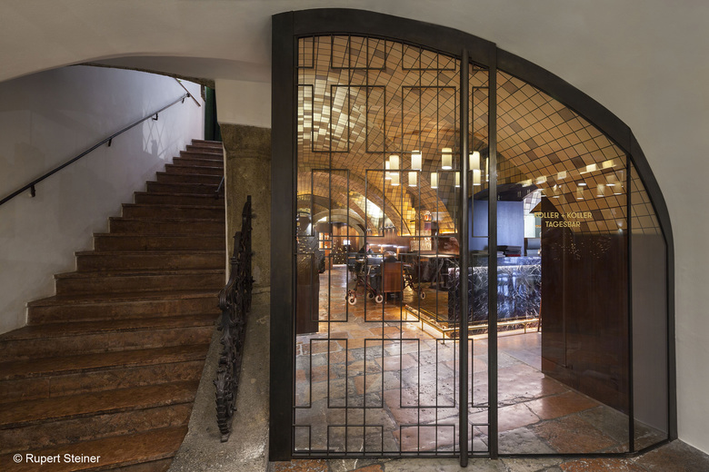 BEHF Architects has envisioned a design strategy which brings in the 21st-century to the interior’s aesthetic, giving it a refreshing and contemporary update, and at the same time highlights the historic characteristics of the city’s iconic building from the 12th century. As part of the redesign, an entrance, dining areas and sanitary facilities located on the ground floor have been renovated. An unused second entrance has been re-opened in order to provide separate, direct access to the upper levels as well as to the Freysauff cellar, which has remained essentially unchanged since its construction. The original design of the spaces distributed over upper floors has been left intact and reflects the history of the family-owned company.