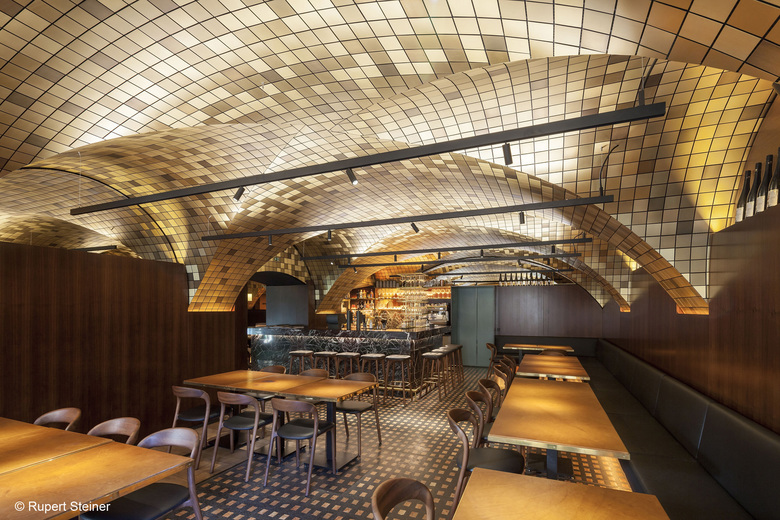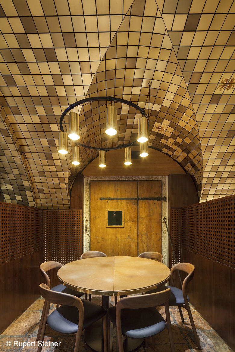 The entire vaulted ceiling of the ground floor is covered with brass mosaic tiles. In order to protect the existing baroque ceiling, the new mosaic ceiling has been installed on a light substructure. The structure is designed in such a way that it optimises the acoustic qualities of the space. Designed by Barcelona-based graphic artist Cristina Spano, the company logo, featuring a vixen and a rooster dancing together, has been randomly distributed on mosaic tiles. It adds the finishing touch to the unique ambience of the place.