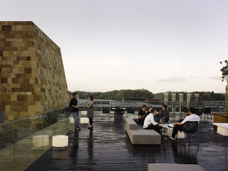 A ramp continues to the foyer on the second level with a panoramic window viewing across the old city and the river. The entrances to the theatre, which also doubles as a large conference hall, meeting rooms and the 400-seat conference room are located in the foyer.The latter is visually connected to the multifunctional hall by means of a raked tribune separated by a glass wall.The route continues to the generous roof terrace with an informal bar located under a lush green pergola. Three sculptural skylights admit daylight into the multifunctional space on the first floor.