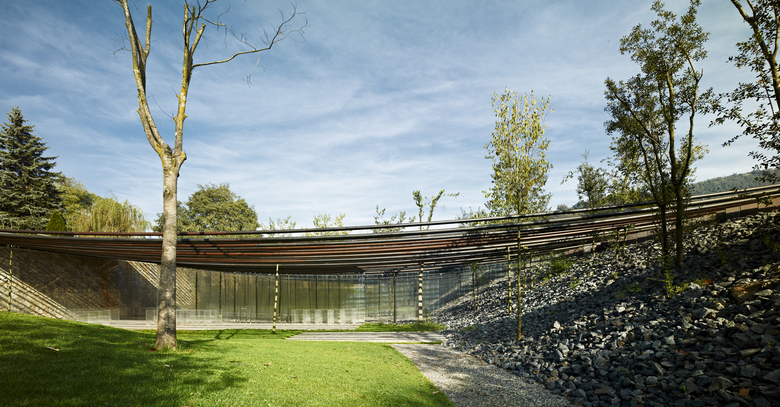 Seeking to evoke family picnics in the countryside or outdoor gatherings with friends, of a bygone time, RCR has created a semi-open event and banqueting space near Le Cols restaurant in Olot, Spain. The terrain was hollowed out to be able to make the structure unobtrusive, but also allow for beautiful views of the surrounding volcanic countryside. The stone that was removed was returned to the site in the form of walls, embankments and pavements. The whole space, which can accommodate hundreds of guests, is covered by a lightweight, transparent roof to protect against the elements. The steel catenaries supporting the roof give it an appearance of “floating”, while the acrylic, almost invisible furniture, allows the people, food and countryside to take center stage.