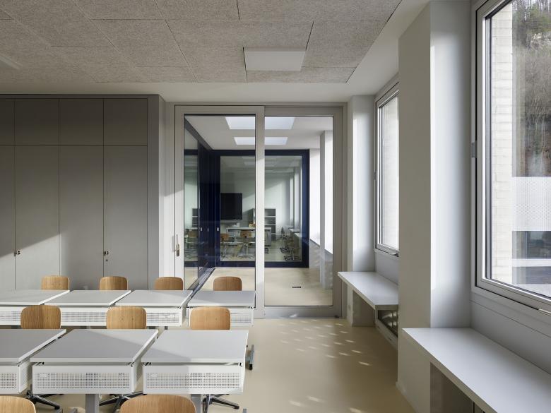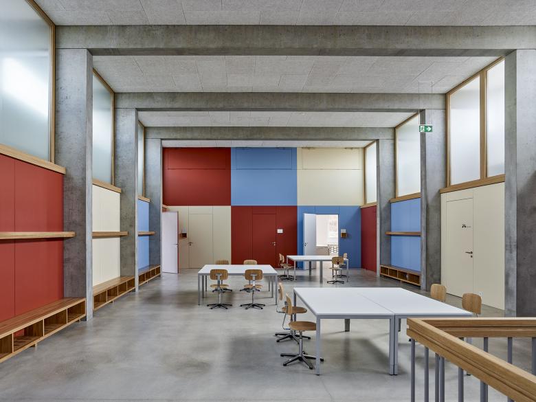 Das Schulhaus wird zum "Lebensraum Schule" – mit Schulräumen, Kindergarten und Aula. Alle Nutzungen können einzeln oder gemeinsam betrieben werden und haben Anteil an einem zentralen Innenraum, der zweigeschossigen Schulhalle. Verbunden werden die beiden Geschosse durch ein freigestelltes multifunktionales Treppenmöbel. Die Schulhalle kann dank des abgestimmten Brandschutzkonzeptes vollumfänglich für Unterrichtsnutzungen gebraucht und möbliert werden und bietet so die Möglichkeit das architektonische Konzept in den Unterricht einzubeziehen. Die Turnhalle ist durch ihre präzise topographische Setzung in die gesamte Sportanlage eingebunden. Ein repräsentativer Eingang mit einem zweigeschossigen Foyer verbindet das Niveau der Hallen mit dem Niveau der zusätzlichen Zuschauertribünen auf dem Niveau der Aussensportanlagen.