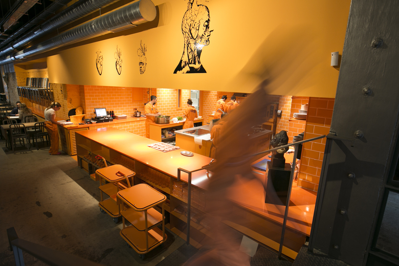 The open kitchen, painted in a striking peach orange to match the team’s uniforms, stands out as the most spectacular element. For the cocktail bar, the use of metallic profiles creates an industrial forest. Overall, the space seeks to awake a feeling of surprise, of the unexpected and a feeling of curiosity which precedes the gastronomic proposal.