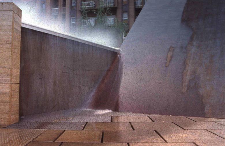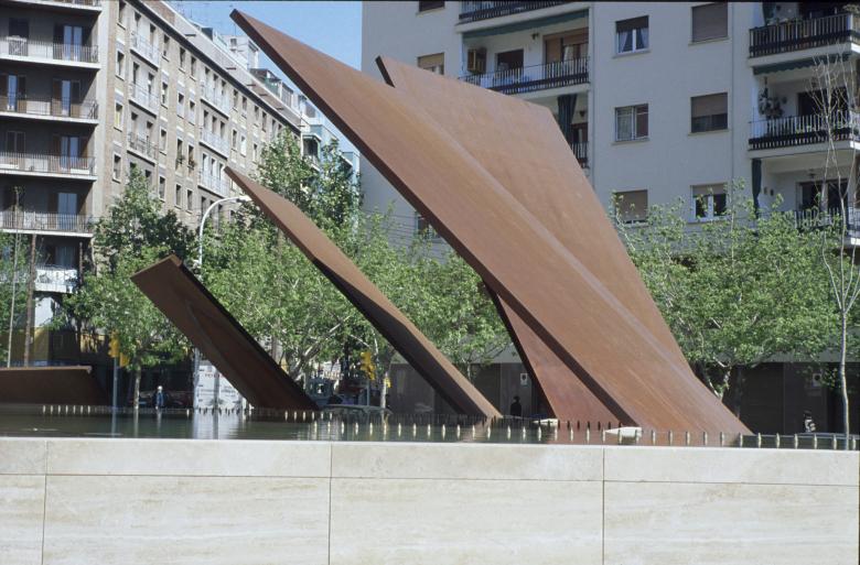street, and is 15 m. wide and 33 m. long. Five huge metal sheets are set into its rectangular form to open up five waterfalls, (named after five Icelandic waterfalls), down the slope of Espronceda street each crowned by vapor spray clouds. The vertical dimensions of the steel plates vary from 4.5 to 8 meters with a uniform 5 m. width, allowing this "tectonic accident" to respond to the scale of the city junction. The space created by these plates, anchored firmly into the ground, enters the passerby into a relationship of earth, water and life.