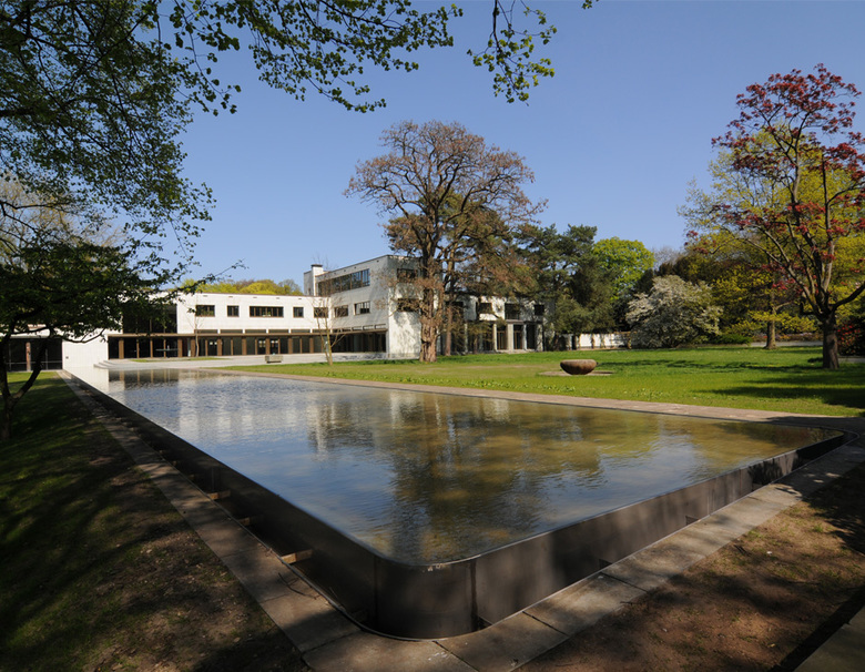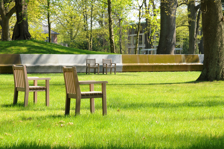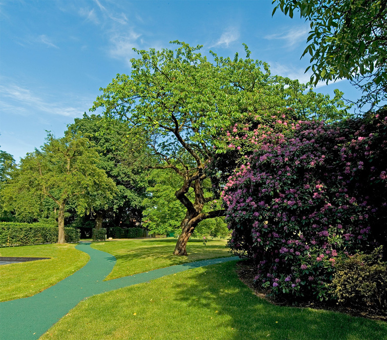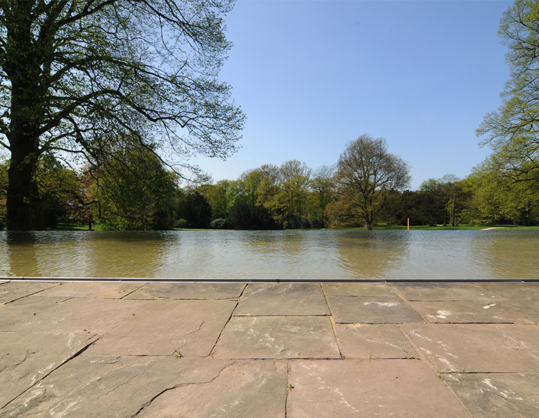 A small number of artistic concepts have been integrated carefully yet systematically into the park. Hence today partial areas of the park form a topographical sculpture in the south, while in the east a rectangular “water-mirror” reflects the sky. In the northwest, the “magical tree circle” and the stone bench covered with a film of water, which also incorporates the change in the height of the site, have been created.