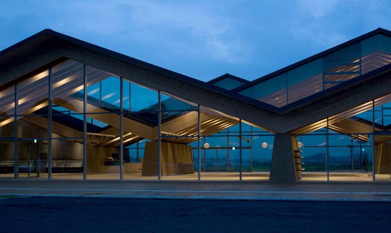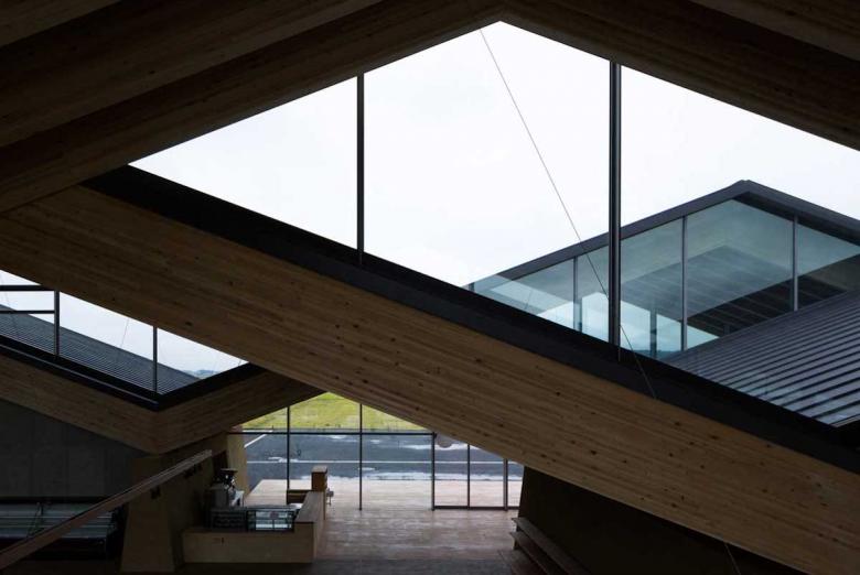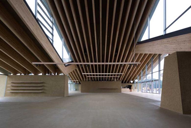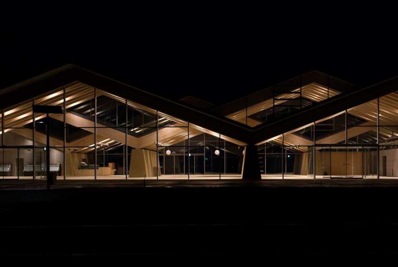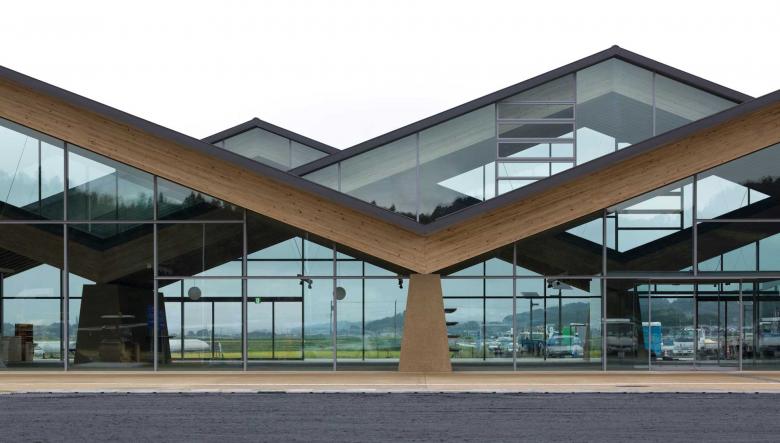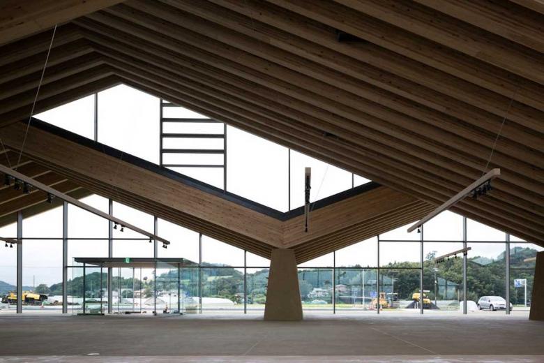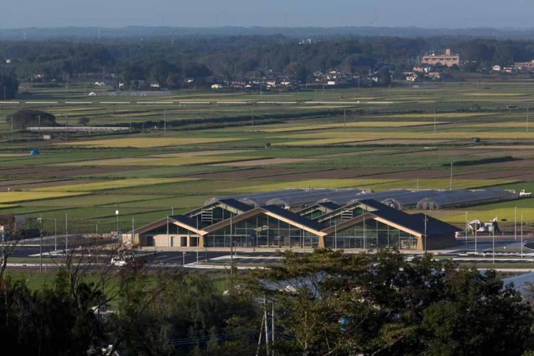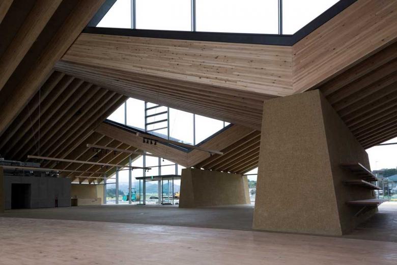 Mashiko in Tochigi is well-known for the Mingei (folk crafts) movement, especially ceramic art. We had visited its southern region for countless times in order to propose a roadside station. The site was surrounded by expansive rurality and farming fields, behind which the serene hills enclosed and differentiated the world from the others. As a local promotion facility, the roadside station should clearly express the regional attractiveness to outsiders while functioning as a kind of local symbol that could also identify local people. Our main idea was to design a building out of what had come into eyes there. So what we were looking for was the one in which formation (form) and material (substance) were all discovered from the scenery to establish locality. The design was coordinated and comprehended through the roof structure covering the whole space, Doma (earth floor), and walls connected with earth. Firstly, the roofscape came from the landscape of the surrounding mountains. Its slope followed the ridges of the local mountains. There were three rows of roofs fluctuating with phase difference to prevent its being a planar background while ensuring a sense of spaciousness. The rhythm of fluctuation and texture took after the local mountains defining the shape of the roof. Besides, the material applied that enabled the roof structure of which largest span could approach 32m was also a local wood, named as Yamizo cedar, processed by local laminated timber factory. On the other hand, the lower part of each walls existed as a continuity of the very earth. Like just rising from the Doma, the trapezoidal walls were purely plastered with on-site soil. Through its massiveness like the sumo ring, it embodied the town's slogan, namely 'hospitality of the soil', showing that Mashiko was characterized by 'blessings from the soil' such as pottery and agricultural products. The interior was defined by the timber structure in line with the mountainous rhythm and the supporting walls that were arranged discretely in order to properly divide the space. The sequence resembling a stroll to the folds of the mountains nearby, which was created by the changes in the size of spaces, and natural light brought down by the clerestories born from the roof phase difference, produced non-homogenous encounters with products. Furthermore, the big openings on the gable connected the interior space with the fields and mountains that stretched in front of them, which built up a direct relation between the food being tasted and the visual scenery. Such architecture extended and undoubtedly further purified the land scenery in both symbolic and experiential terms. Similar to ceramic art, perhaps it was a result brought by the secondary nature recreated through people’s interpretation of that land scenery. The architecture made from scenery while creating scenery was exactly what we pursued.