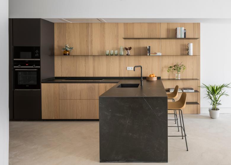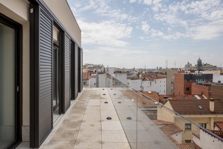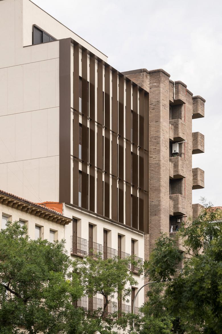 The new envelope has an exterior masonry enclosure with exterior insulation that allows for large sliding windows in the new floors. The original facade is carefully restored, maintaining the original balconies and applying a plaster in the same tone as the new one, so that both facades are aesthetically unified.