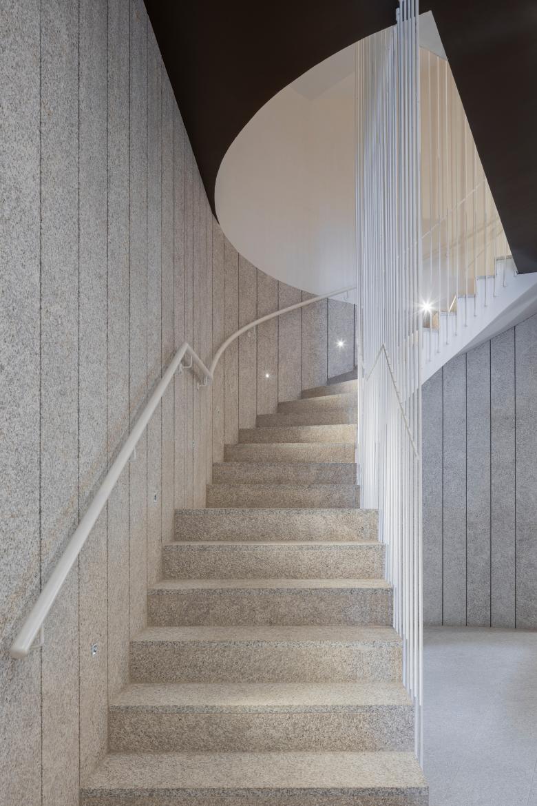 In the interior, the floorplan is organized around a curved staircase, creating a central core from which the apartments are distributed along in two orientations. This vertical circulation space is closed off by a lightweight structure that allows zenithal light to filter through to the lower levels, giving this space a unique character.