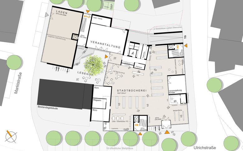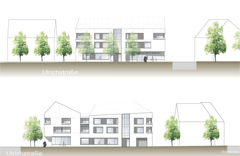 Die auf Erdgeschossebene der Häuser 3+4 angeordnete Bücherei ist barrierefrei erreichbar und erhält ihren Haupteingang an der Ulrichstraße. Der leicht zurückgesetzte, großflächig verglaste Zugang wirkt einladend und ist vom Straßenraum aus gut sichtbar.