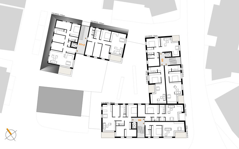 Die darüber liegenden Obergeschosse sind der Wohnnutzung vorbehalten und im System von Zwei- und Dreispännertypen organisiert, die durch insgesamt drei Treppenhäuser mit Aufzügen barrierefrei erschlossen werden. Das Wohnungsgemenge der 21 Wohnungen entspricht dem in der Auslobung gewünschten Mix an Zwei-, Drei-, Vier- sowie Fünfzimmer-wohnungen. Um eine größtmögliche Privatheit zu gewährleisten, verfügen alle Einheiten über blickgeschützte, überdachte Loggien. Küchen können wahlweise offen mit den Essbereichen als Wohnküchen oder geschlossen ausgeführt werden. Leichte Trennwände bieten die Möglichkeit, Zimmergrößen zu variieren bzw. individuell zu kombinieren. Fast alle Wohnungen erhalten ein Tageslichtbad, die größeren Einheiten zusätzlich ein weiteres Duschbad. Es besteht die Möglichkeit, einen Teil der Wohnungen bei Bedarf über die nach LBO geforderte Barrierefreiheit hinaus auch rollstuhlgerecht auszuführen oder für einen entsprechenden Ausbau zu einem späteren Zeitpunkt vorzubereiten.