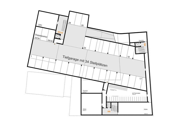 Die primär den Wohnungen aber auch den gewerblichen Einheiten in Haus 1 vorbehaltene Tiefgarage wird über eine an der nördlichen Grundstücksgrenze gelegene einspurige Zufahrtsrampe mit Ampelschaltung angefahren und verfügt über 34 Kfz-Stellplätze sowie über die nach LBO erforderliche Anzahl an Fahrradabstellflächen. Darüber hinaus werden für die gewerblichen Einheiten 2 Stellplätze oberirdisch an der nördlichen Grundstücksgrenze erstellt. Die Anzahl der Kfz-Stellplätze entspricht dabei dem in der Auslobung vorgegebenen Stellplatzschlüssel. Die Untergeschossebene ist an alle drei Treppenhäusern barrierefrei angebunden.