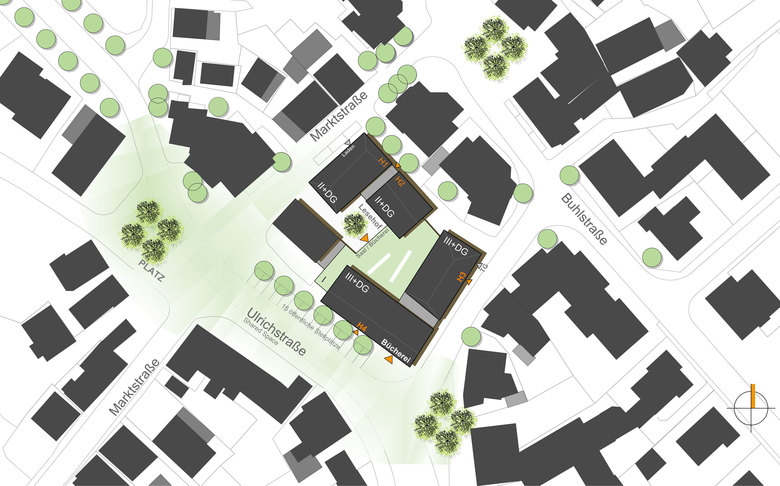 Im Zuge einer Neubebauung des Grundstücks Marktstraße 18 könnte die Ulrichstraße zu einem verkehrsberuhigtem 'Shared Space' mit neuem Fahrbahnbelag umgewandelt und in Verbindung mit einer attraktiven, baumbestandenen Platzgestaltung eingangs der Marktstraße zum Nutzen des Ortskerns erheblich aufgewertet werden.