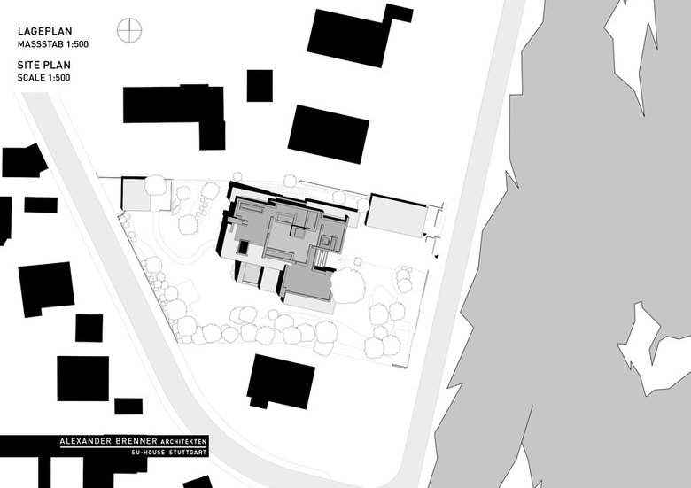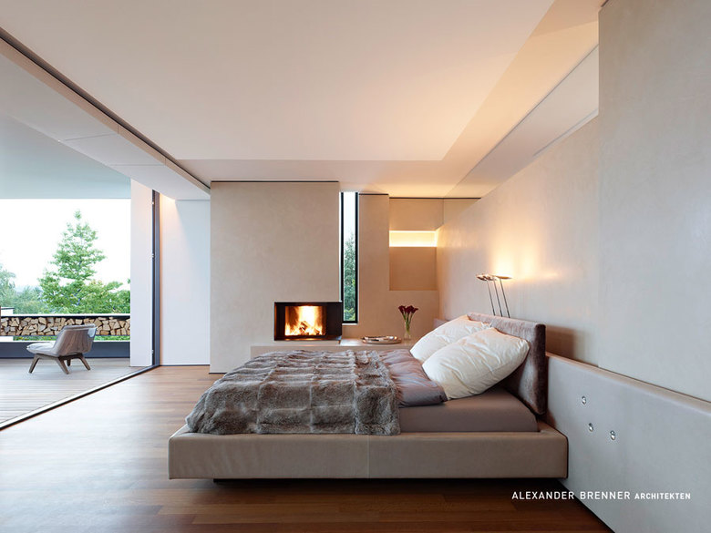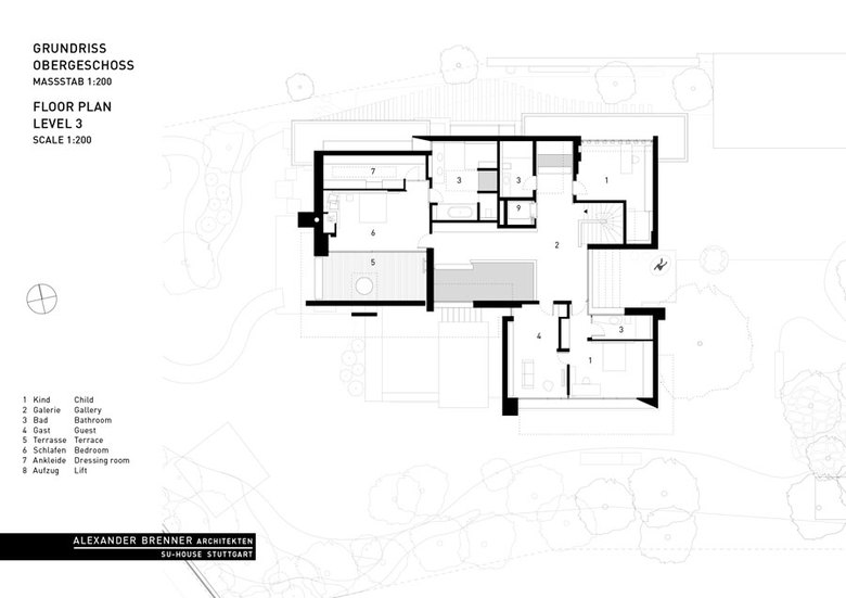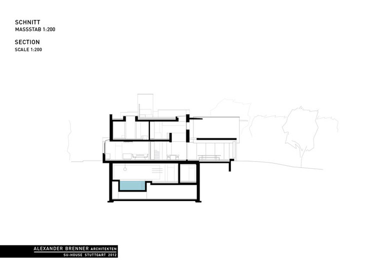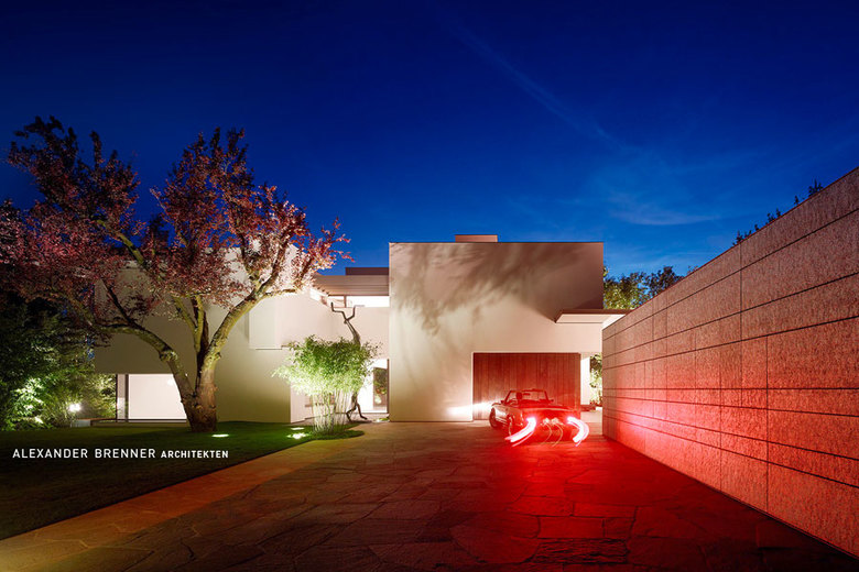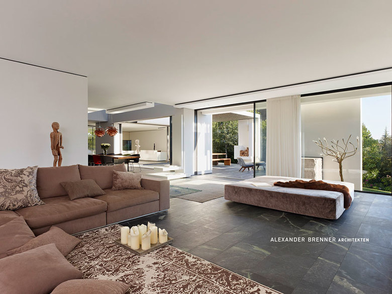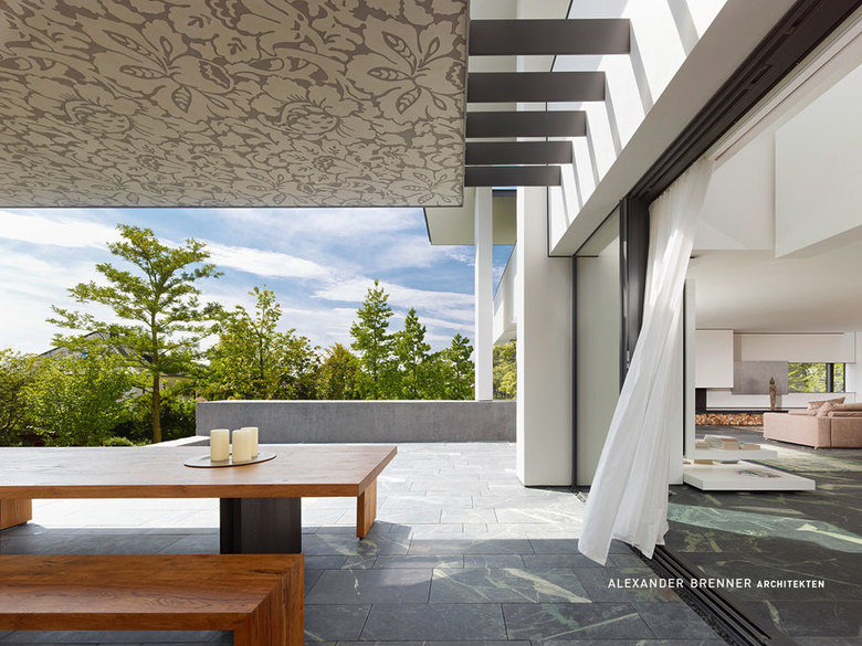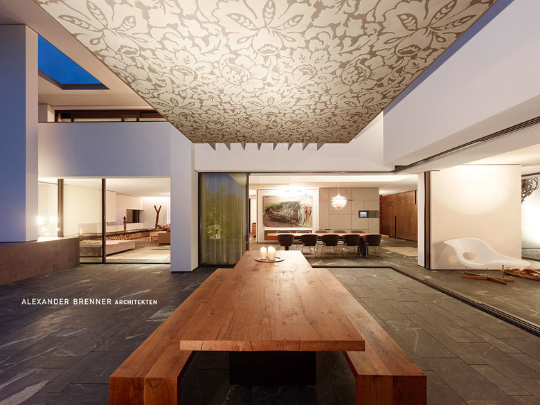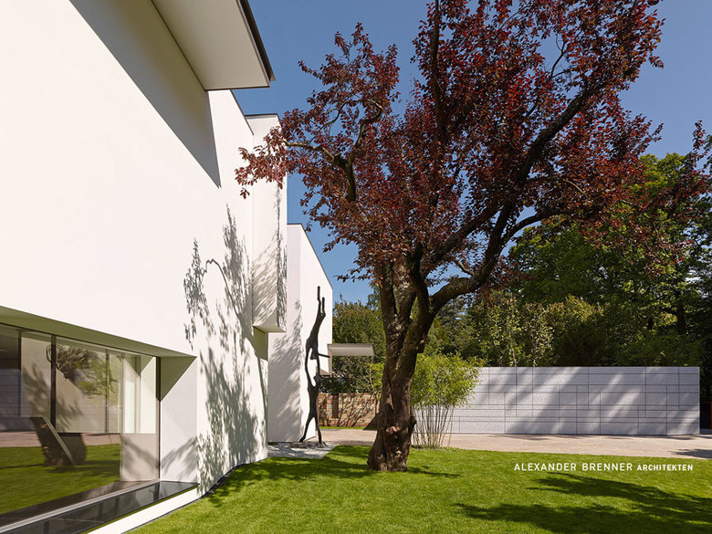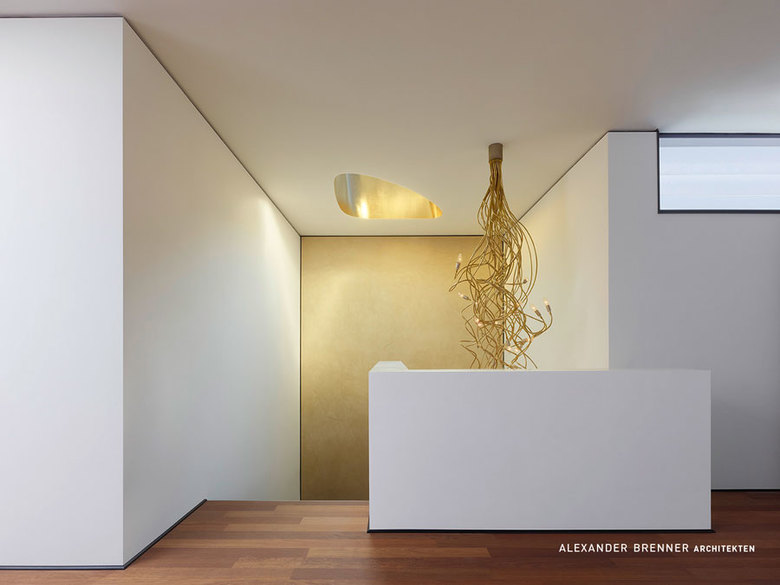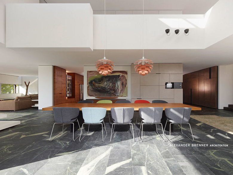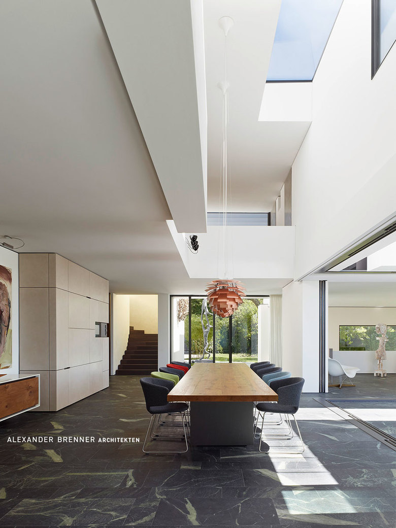 A large, broad fireplace directs to the living area, which was planned as a more secure and intimate place. A full-width skylight at the back sends light beams onto the wall with paintings and sculptures.From the southern office- and workspace a narrow sculptural staircase leads down to the studio. This two-storey high, almost sacral area serves to present works of art - a passion of the client. Right next to the studio a storeroom for artwork is attached. The majority of the garden level consists of the pool and spa area.
