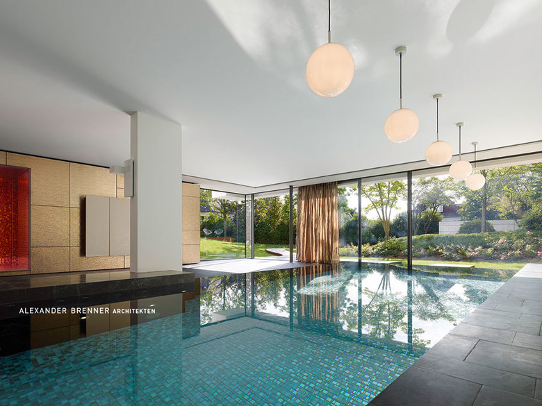 The part of the sauna and steam bath is an introverted area which is kept in warm red and gold tones all around. The indoor swimming pool on the other hand opens with a floor-to-ceiling glazing towards the lower south-west part of the garden.