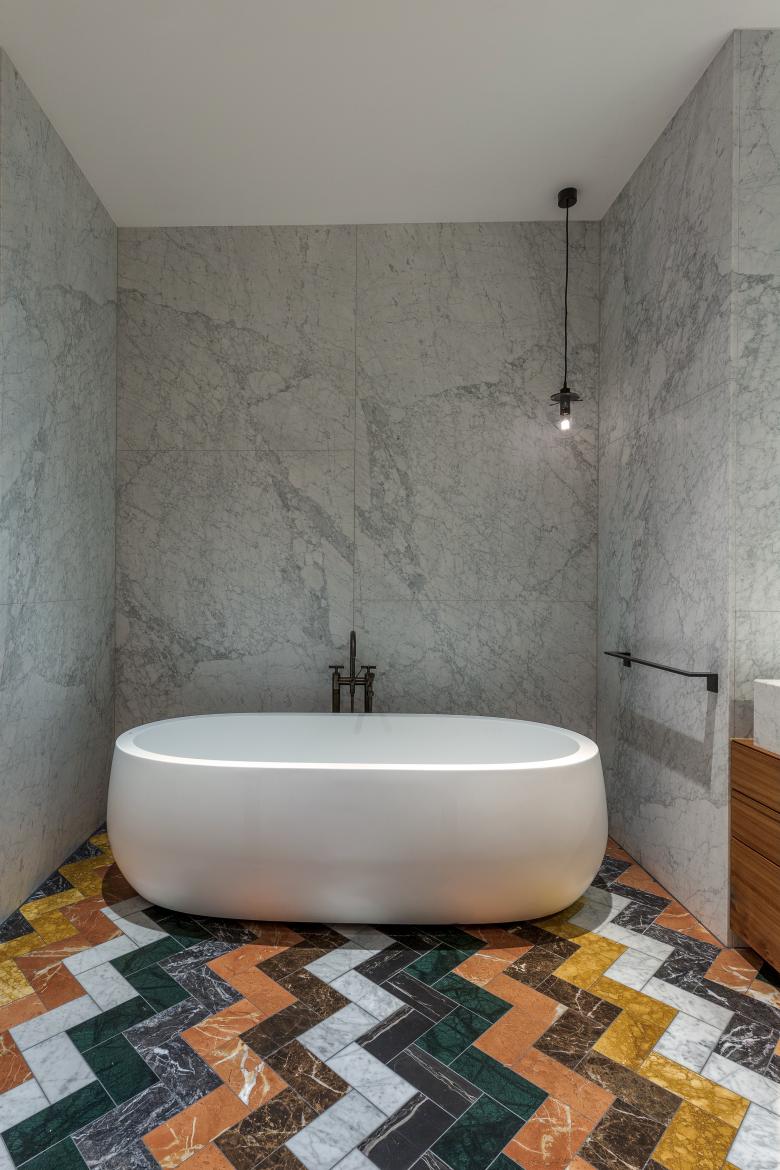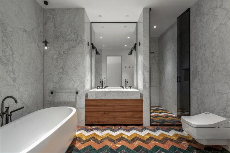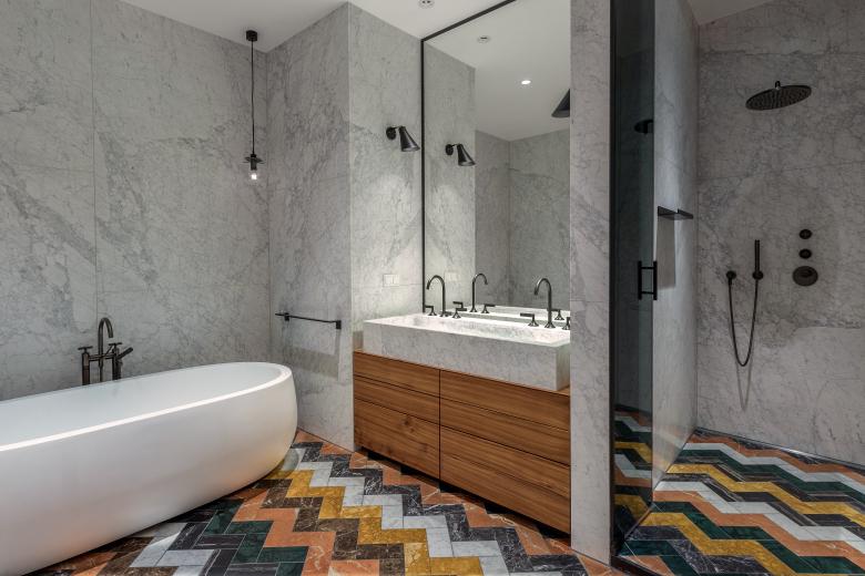 Pure luxury: there is a touch of Hollywood glamour in this rebuilt loft in Berlin. As requested by the clients, originally from Los Angeles, these bathrooms exude sophistication with their fancy design. The beauty of natural stone in all its facets plays the starring role. With its unique grains and subtle details, stunning white Italian marble lines the walls from top to bottom with matching high-end washbasins. This versatile natural stone with its richness of colors also decorates the floor in a distinctive wave pattern. Bespoke elm wood furniture and stylish fittings in dark platinum round off the engaging scene.