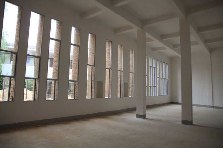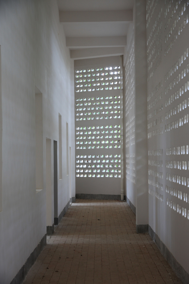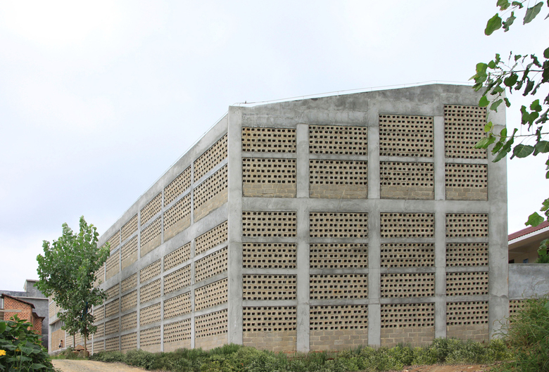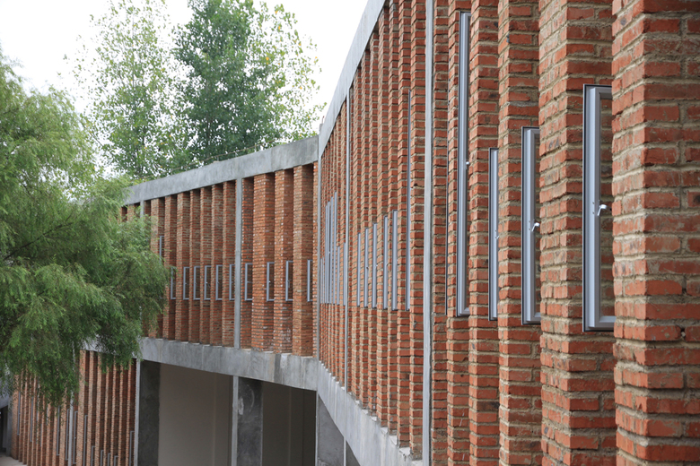 The intention is to make use of these waste materials in the construction of the new school through re-deploying this material in innovative ways. The roof is formed from recycled brick waste and rubble that thickens the roof to provide additional thermal mass cooling the building in summer and retaining heat during the winter. The rubble acts as a substrate for natural greening from wind-blown plants, mosses and lichens. The roof steps down to join the wall which gradually becomes more open through perforations in the brick patterning. This external skin protects the internal classrooms from excessive solar gain yet allows for natural ventilation through the teaching spaces. The wall and roof form a thickened edge to the street façade allowing the more protected façade to the courtyard to be opened up comprising concrete fins and vertical glazing. The fins vary in size for different functions: thin strips for solar protection and wider C-sections that contain bookshelves within the classrooms.