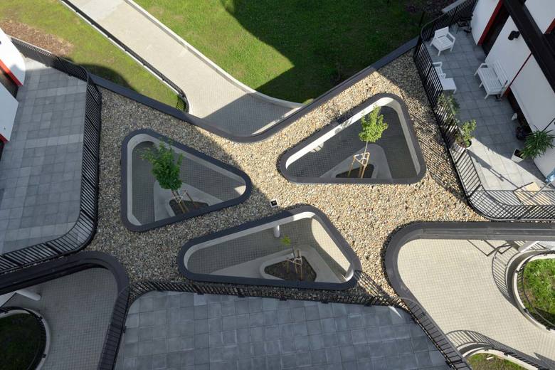 The construction consists of three irregularly shaped five-floor apartment blocks sitting on a common plateau with underground parking and storage space. This raised bastion is defining the surrounding public space and protects the private and semi-private gardens from the street traffic. The organic form of the objects mediates the transition between the adjacent high density housing blocks and the public park. The whole building composition is radially evolving from a central entrance “plaza” which is roofed and serves as a common meeting and relaxing area.
