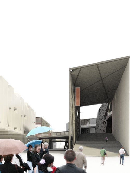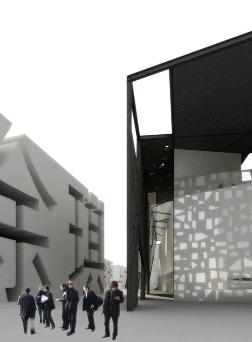 The site is located between Nanjing downtown and the airport in a development zone along the Qinhuai river that passes through the city as well. A group of architects works together on the bar and shopping area with a master plan defined by Tongji University. Our mission is to enclose the two squares in both ends of the site with other architects, and to introduce two pedestrian streets. The approach is using the difference in topography to make a three dimensional street network, which allows the people to reach easy every single shop, and to create more public spaces.