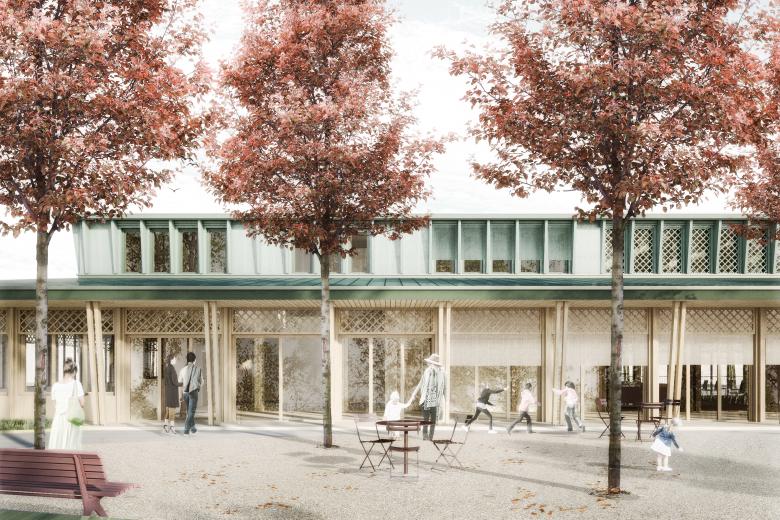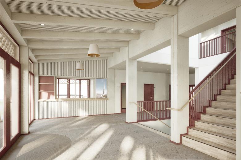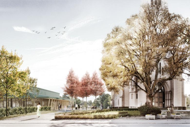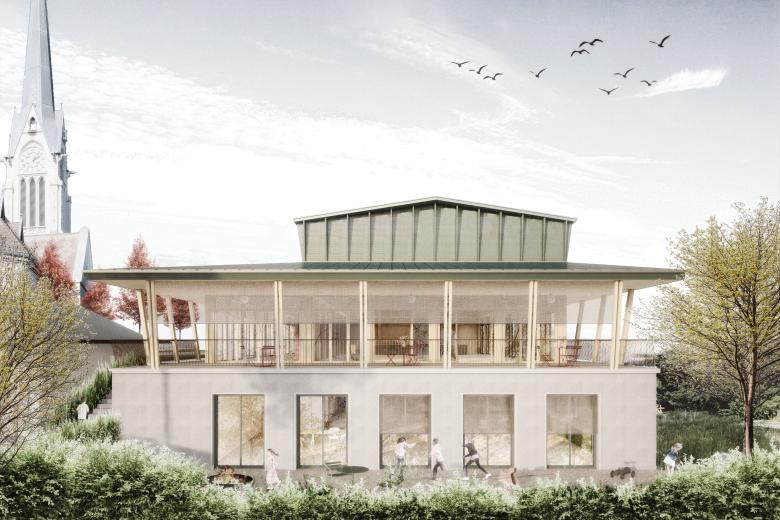 Der Projektvorschlag gründet auf der Idee eines einladenden Kirchgemeindezentrums mit offenen Türen für alle. Die Kirchgemeinde verbindet als Gastgeberin die Dorfteile, Aussengegenden, Generationen, Kulturen, Altersgruppen und Lebenswelten. Das Freiraumgefüge ordnet sich den vorgefundenen Qualitäten der heutigen Anlage mit der Kirche als kantonal geschütztes Kulturobjekt unter. Zwischen der Kirche und dem Eingang des Kirchgemeindezentrums wird ein ellipsenförmiger Freiraum angelegt und mit fünf Kirschbäumen bepflanzt. Der fein