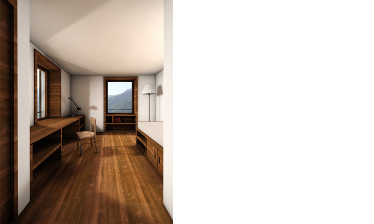 Zwischen diesen beiden Volumen entwickelt sich einerseits ein Hof, sowie gegen Osten einen Abschluss zur Landschaft, wie dies bereits am Zuozer Dorfausgang gegen S-Chanf der Fall ist.