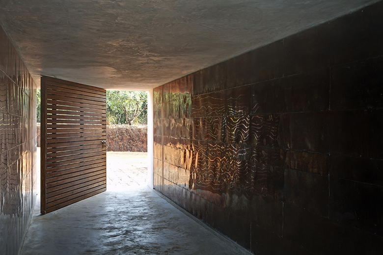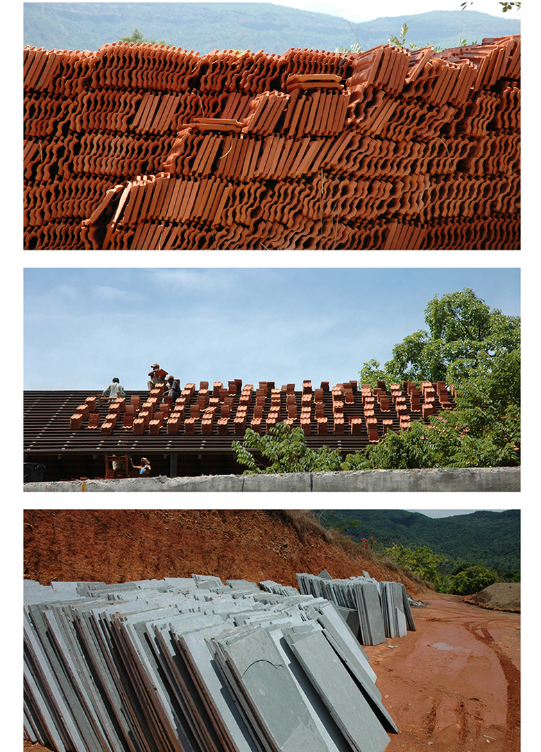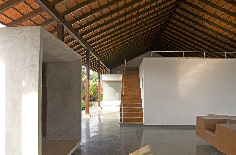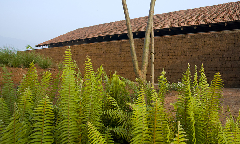 Located in the verdant environs of eastern Goa, the Think Tank Retreat is composed of ten living units and a health centre. The ancillary programs of the health centre (massage rooms, a conference facility and kitchen) are imagined as independent boxes that are integrated with a common plinth under a large clay tile roof. The terraces of each of these separate boxes are also accessible and serve as useable covered spaces for informal meetings, yoga, and meditation.