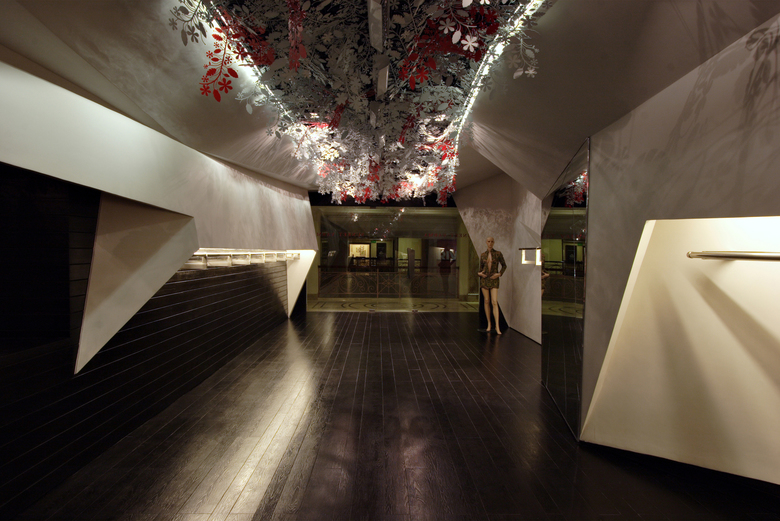 The concept for the store was based on Origami – an idea of a space enclosed by folded planes of paper and initial forms were explored by making rudimentary studies in paper. The permutations of these forms were then studied and reconfigured using numerous scale study models of the space. Eventually the design was finessed using 3-D modeling software that was instrumental in generating the 28 sectional profiles that served as the basis for the working drawings.