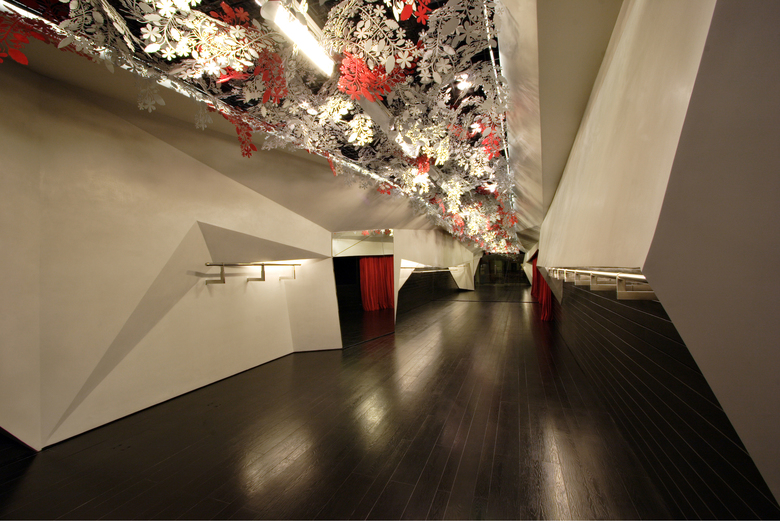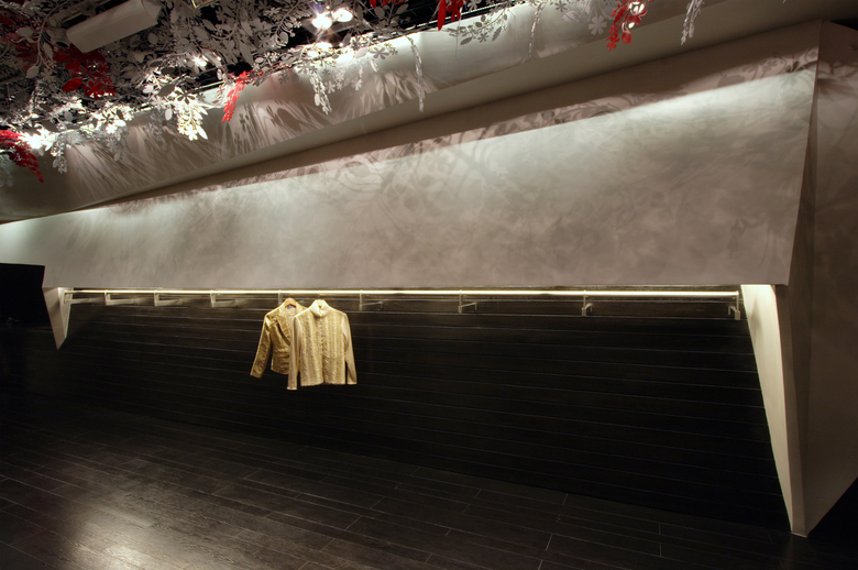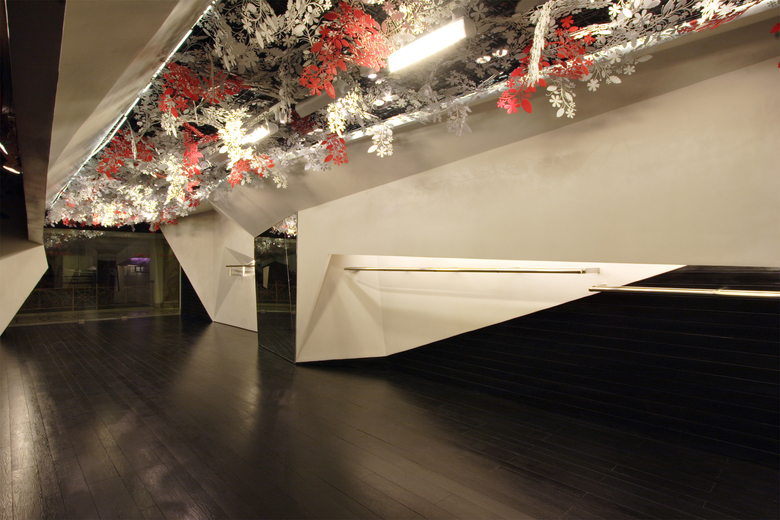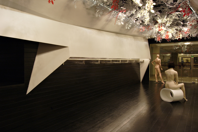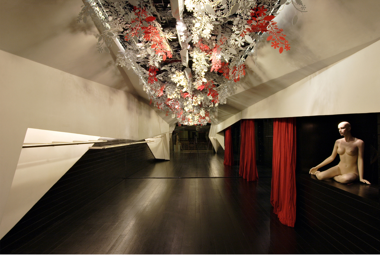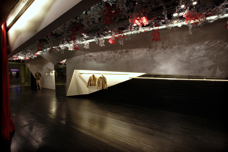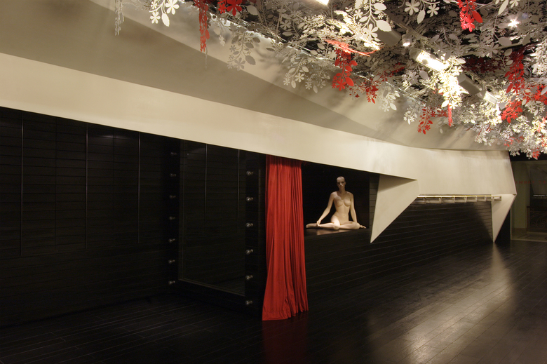 The design consists of two folded white planes suspended inside a dark wooden box. Contained within these planes are various functional requirements, from the main garment display racks [lit from above] to the AC ducts and vents. The cash counter was also tucked behind one of the planes, as is the large dressing area which is closed-off with a thick red curtain. Suspended from the metal trellis false-ceiling are hundred of flowers, lazer-cut from sheets of acrylic - a boisterous assemblage that offers a striking contrast to the straight lines of the folding planes below.