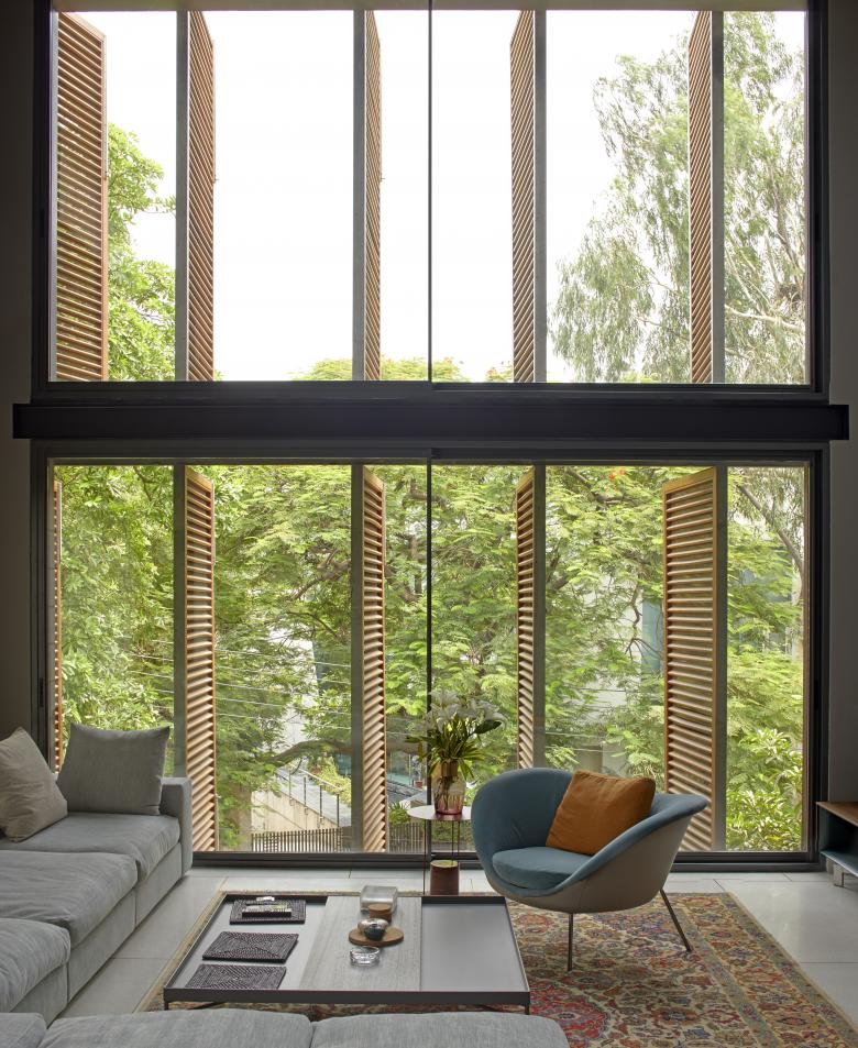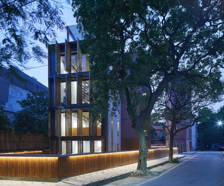The Tower House is a multi-generational home on a peculiar wedge-shaped site, on the end of a row of semi-detached buildings in New Delhi. The building is conceived as three distinct masses that respond to the site’s geometry and the family’s needs. In a city where the urban texture is increasingly defined by plaster buildings clad with laminates and textured paints, the tower house attempts to bring back an architectural language that appears to be slipping away from our urbanscape. Internally also, countering the tendencies towards false ceilings and decorated surfaces, the building celebrates the exposed concrete ceiling, cast in situ floors and exposed brick walls. The narrow front portion of the house comprises of 2 living spaces, both double height which sectionally connect the four floors of the house. Materially the front block is constructed out of stone and wooden louvers with the fenestrations informed by the sight lines defined from within the building. The second block is the private living space for the family. Sectionally simpler, this block is constructed in brick and steel and set within a very rigid geometric grid of open and closed zones. In an increasingly digital age, the house aimed to disrupt trends of cellular living by designing common spaces that allow for autonomous and collective living at once. The double height family spaces force social contact in perhaps a banal but vital day to day manner. The third block is a service tower which houses staff living spaces, generators, water pumps and other services. This tower is a reconstructed remnant of the previous building that stood on the site and a reminder of the site geometry.