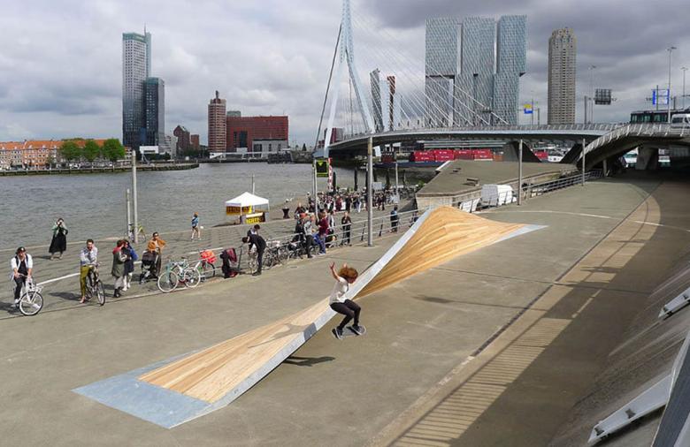 The structure is imagined as a metal framework on which wooden pieces are fastened, allowing it to be a light and easily transportable object. Therefore the structure can be “plugged in” anywhere in the city so skateboarders and pedestrians can enjoy a wide range of landscapes while skating and walking through Rotterdam.