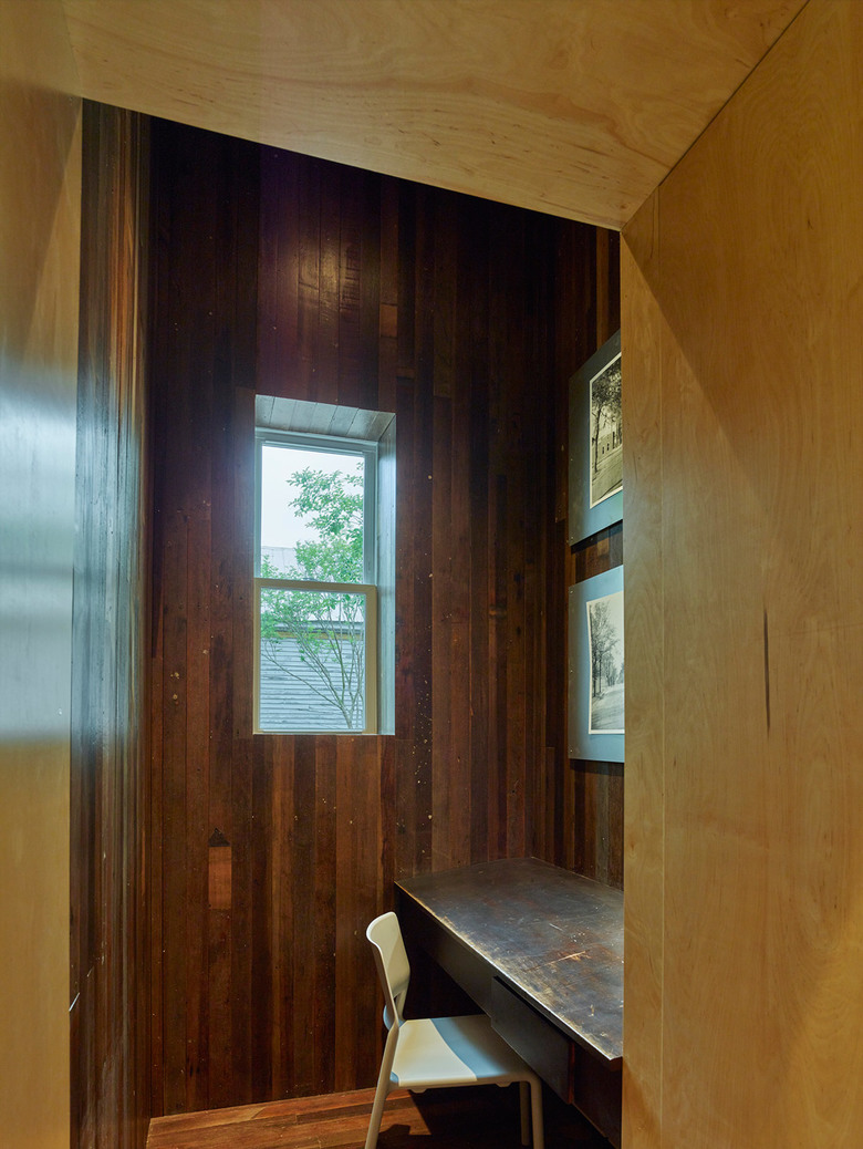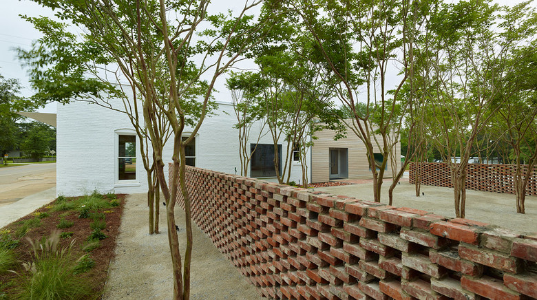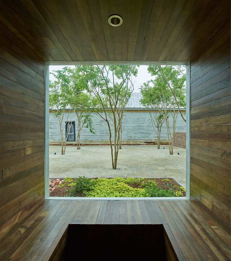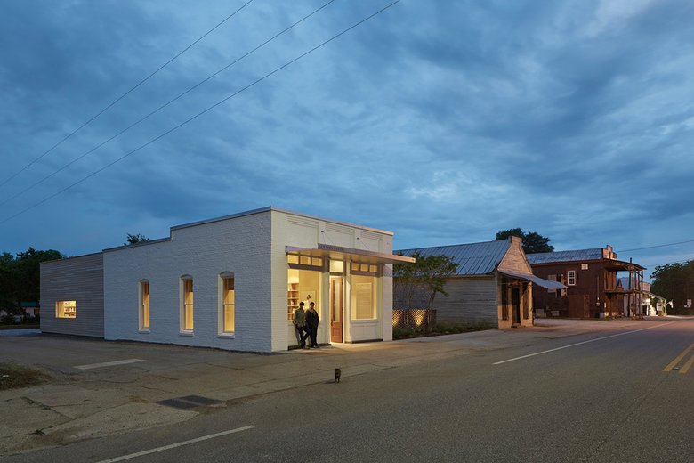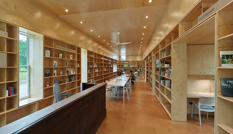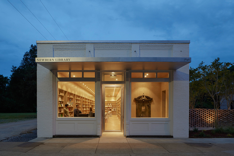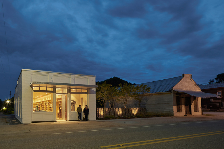 The Newbern Library is an adaptive reuse project of a bank building built in 1906. The student team navigated the project throughout conception, fund raising, design, construction management, and physical construction. Through the process of designing and making the building, the team coordinated with consultants, community partners, and fabricators, producing design and detailed construction documents, sourced materials, and organized schedules and budgets. The preserved masonry shell of the existing building contrasts with the addition, which is clad in local cypress siding. Bookshelves center a new space within the width of the old building creating a room where readers are immersed in books. The modular bookshelves are made of birch plywood, and were CNC-milled, finished, and assembled on site. Complementing the larger public space, a series of alcoves within the bookshelves accommodate computers, private study nooks, window seats, storage closets, bathrooms, and access the outdoors. The artifacts from the original building, such as the old heart pine floors and bank vault door, were repurposed and preserved inside the new space. A courtyard to the north of the building provides library patrons with shaded outdoor reading and activity space.