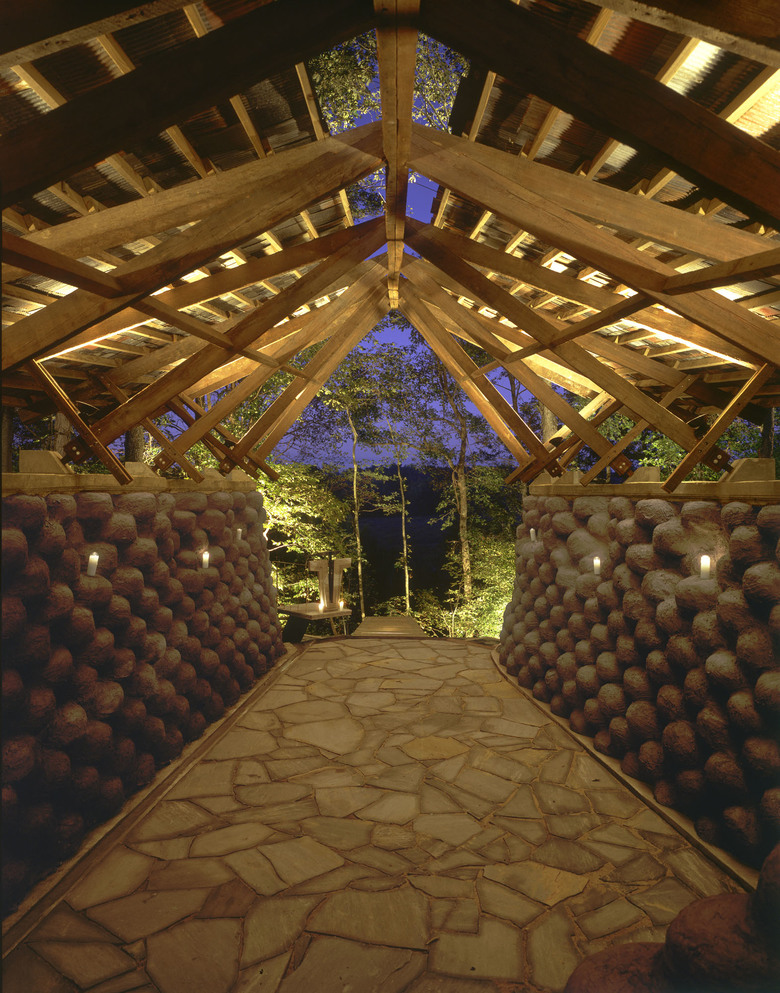 Small chapel built of recycled tires, river rock and repurposed wood and tin.