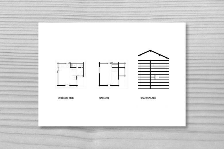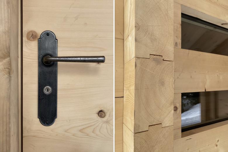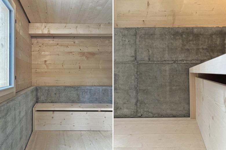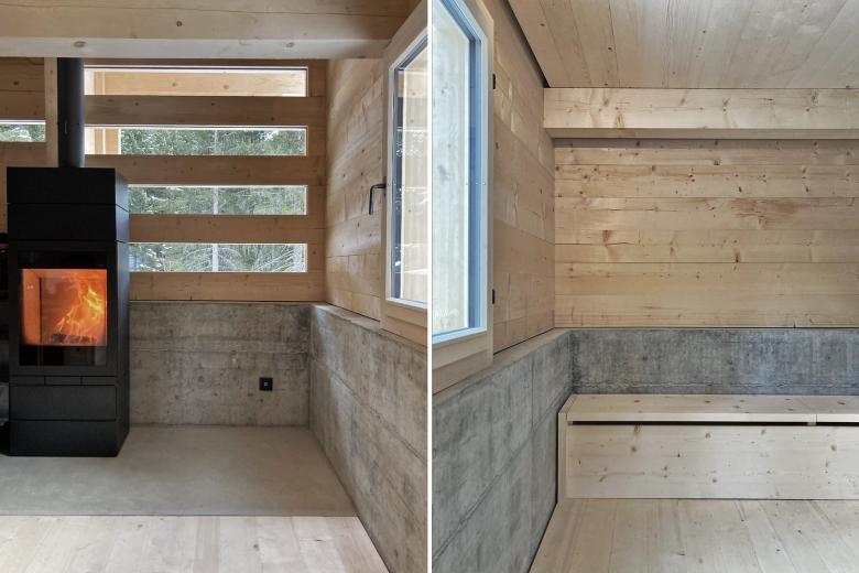 Das Holz dafür kommt vom gegenüberliegenden Nordhang welcher sich in Sichtdistanz zum Bauplatz befindet. Der Holzbau ruht auf einem Sockel aus rauhem Sichtbeton, welcher als wasserdichte Wanne ausgebildet wurde um den Hangdruck und dem im Winter meterhohen Schnee bestehen zu können. Boden und Dach sind gedämmt, die Wände sind bewusst nicht zusätzlich isoliert um das Material in seiner natürlichen Oberfläche altern zu lassen. Die Quelle welche ca. 200 Meter über dem Grundstück gefasst wurde, versorgt die Hütte mit frischen Quellwasser, Strom wird durch ein PV Modul auf dem Dach erzeugt.