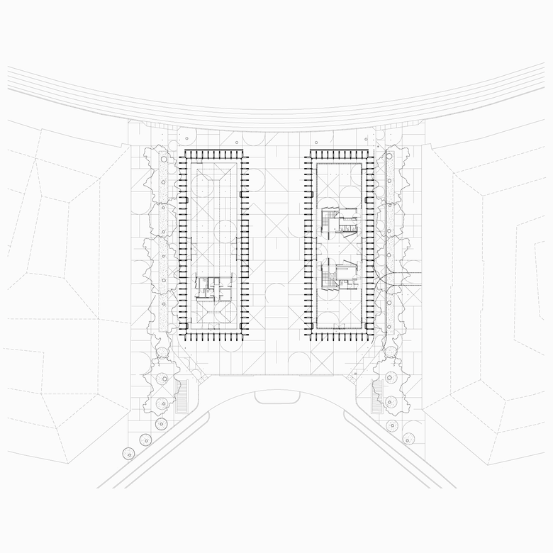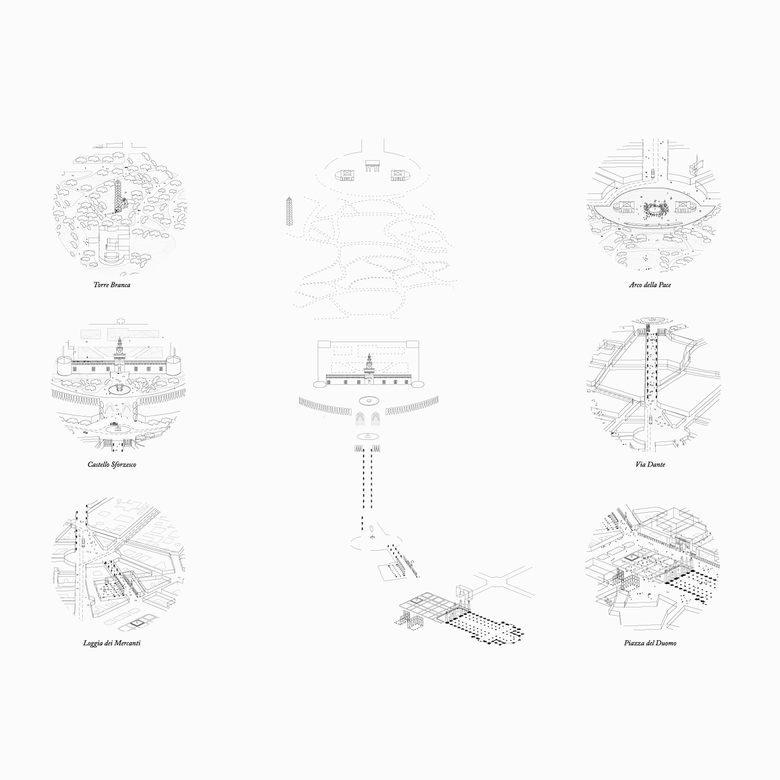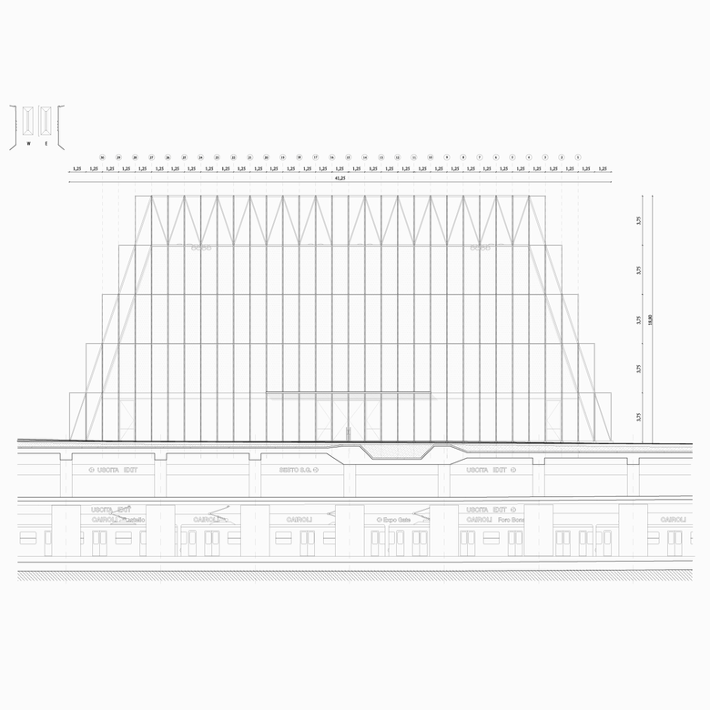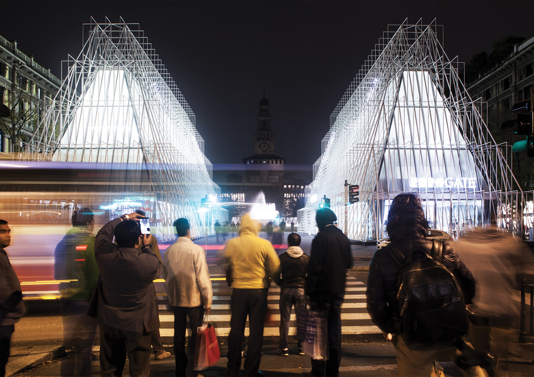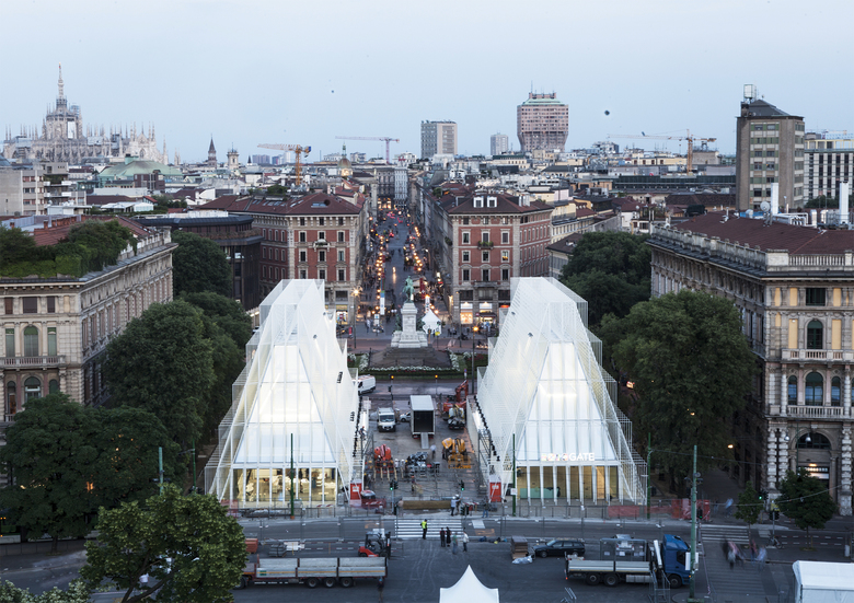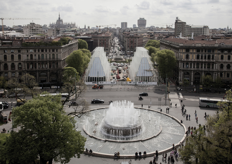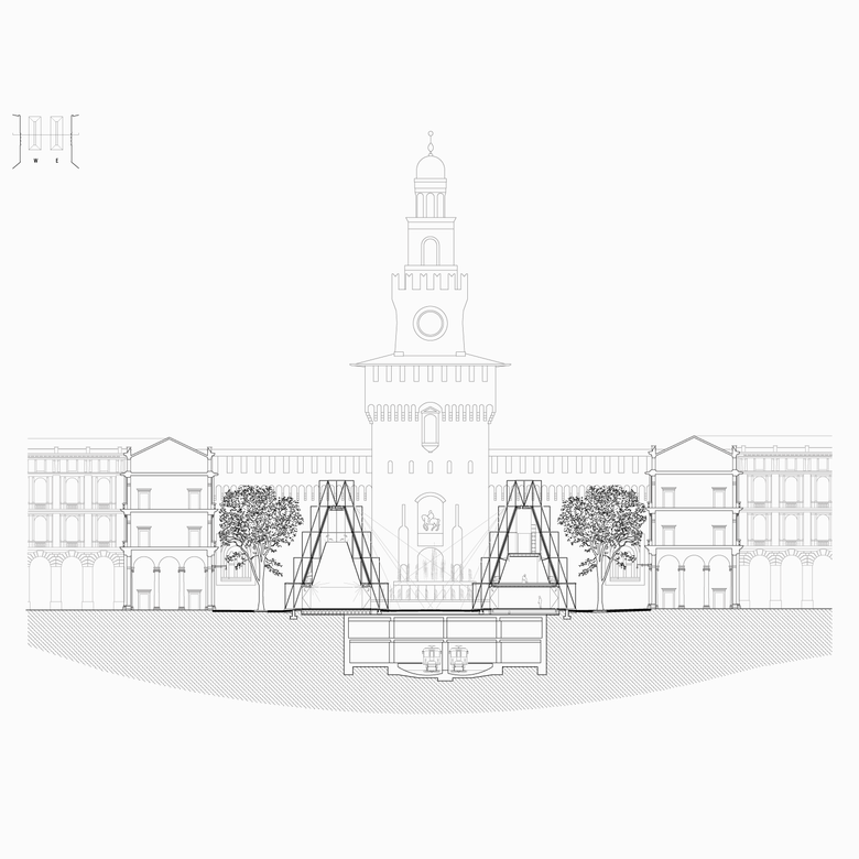 The project features a great open space, a central square between two “tollbooth-like” pavilions: the gate to EXPO 2015. The central square is conceived as a fascinating void, an empty space which can host different kind of events.