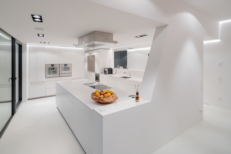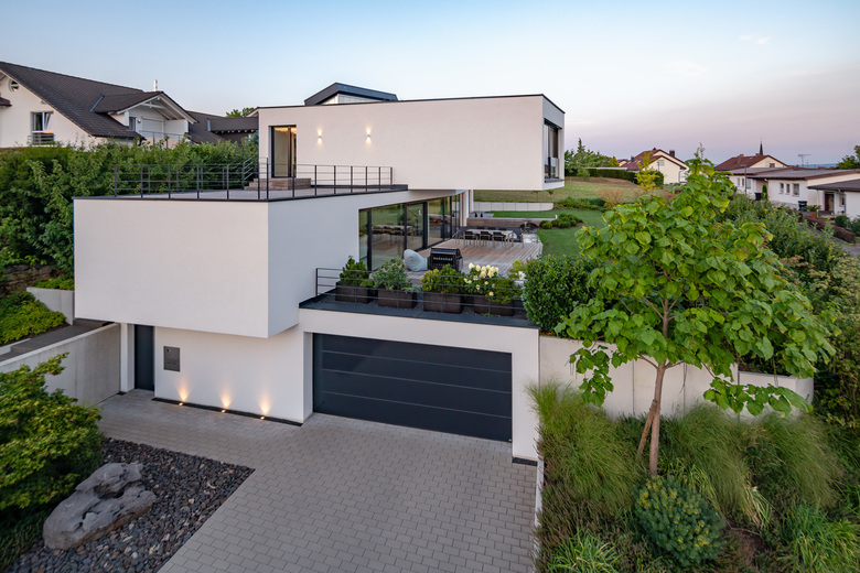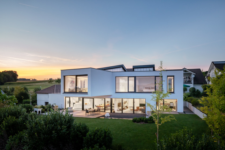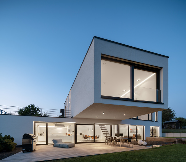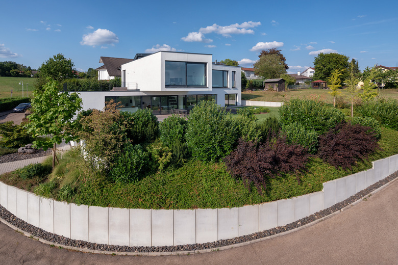 Das Gebäude erstreckt sich längs der nördlichen Grundstücksgrenze und erweitert durch eine eckig konvexe Form seine Oberfläche Richtung Aussicht welche sich bereits im Erdgeschoss bietet. Da das Erdgeschoss mehr als 2,50m über der Straße liegt ist die Privatheit der Bewohner gewährleistet. Im Obergeschoss wurde der Westliche Gebäudeteil herausgedreht und fokussiert sich auf die Aussicht.