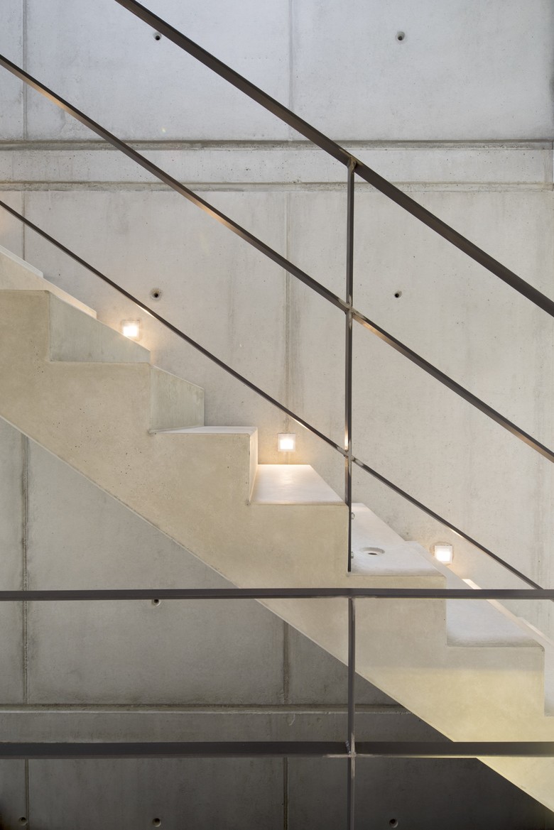 Das Fassadenbild wird geprägt durch unterschiedliche Öffnungen die jeweils speziellen Belichtungssituationen der einzelnen Räume Rechnung tragen. So befindet sich z.B. am oberen Ende des Luftraums im Westen ein schmales Fensterband das dafür sorgt, dass die untergehende Sonne ins Gebäude fällt und den Raum in ein oranges Licht taucht.
