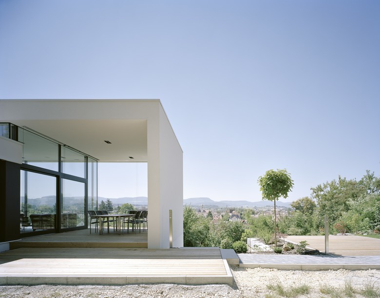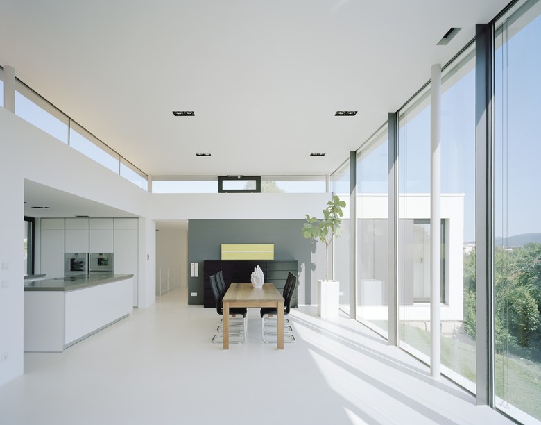 Das Gebäude wird durch zwei Bänder definiert. Ein Band umschließt die privaten Räume wie Schlaf- und Kinderzimmer während sich das zweite Band gegen das erste lehnt und in diesem Zwischenraum Terrasse, Wohn- und Essbereich schafft. Dadurch ergibt sich räumlich eine Einheit von Wohnen, Essen und Freibereich der durch eine Verglasung vom Wohnbereich getrennt ist. Der gesamte Wohn- Essraum wurde erhöht und weist eine Raumhöhe von 3,75m auf. Der Raum ist rundum verglast und trotzdem kaum einzusehen, da alle Straßen talabwärts parallel zu Hang laufen und das Gebäude durch die Nachbargebäude verdeckt ist. Dem Wohn- Essbereich zugeordnet sind Küche und Medienraum. Alle Räume orientieren sich nach Süden zur Aussicht und weisen nur geringe Öffnungen nach Norden auf um unnötigen Energieverlust zu vermeiden. Im östlichen Bereich des Gebäudes sind die Privaträume der Eltern untergebracht. Das Schlafzimmer und das Bad befinden sich in einer drei Meter tiefen Auskragung frei in der Luft. Das Schlafzimmer hat eine Verglasung auf dem Boden, durch diese ist der Blick vom Bett über Eislingen bis zur Alb möglich. Das Bad endet in einer Dusche an deren Ende ebenfalls eine Verglasung steht.