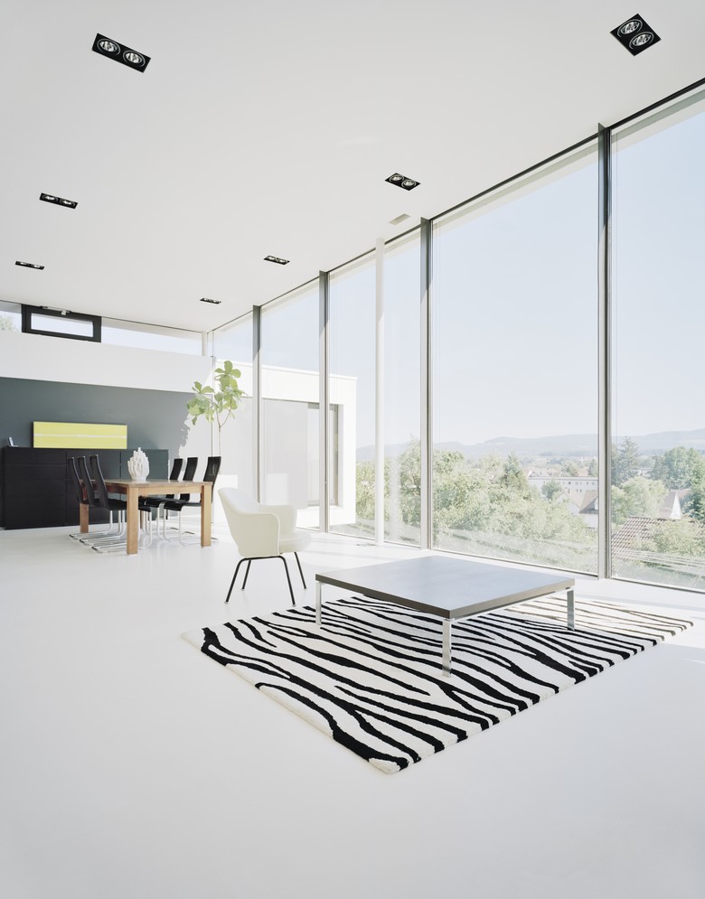 Durch diese Blick man an der Hangkante entlang ins Grüne ohne, dass ein Einblick möglich ist. Erschlossen wird der Privatbereich über eine grosse Garderobe und einen Schrankraum die jeweils gleichzeitig den Flur bildet. Das Untergeschoss liegt einseitig im Hang was dazu führt, dass auf dieser Seite Abstellräume und Technik untergebracht sind. Kinderzimmer und Bad befinden sich auf der Südseite mit ebenerdigem Ausgang in den Garten. Der Freibereich des Untergeschosses befindet sich wettergeschützt unter der Auskragung des Erdgeschosses. Das Untergeschoss kann durch das Entfernen zweier Wände zu einer offenen Zweizimmerwohnung umgestaltet werden. Die vertikale Erschließung des Hauses liegt ebenfalls so, dass eine Abtrennung möglich ist.