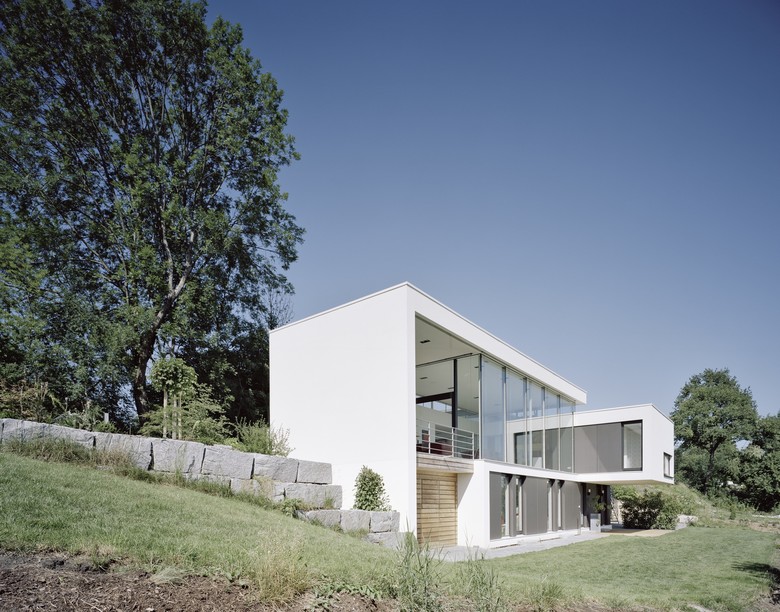 Das Haus entwickelt sich entlang des Hangs mit einer Gesamtlänge von ca. 28,00m. Im Norden zeigt sich die Fassade lediglich eingeschossig, während sie im Süden zweigeschossig ist.