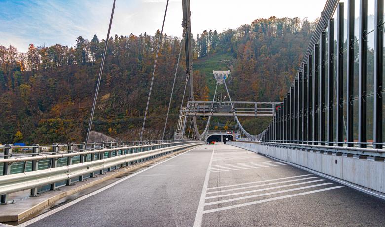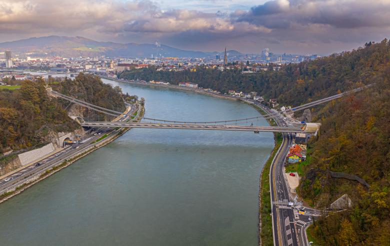 The bridge across the Danube river in Linz is part of a major Austrian infrastructure development – the A 26 highway, a four-lane western bypass for the city of Linz – and it crosses one of the busiest waterways in Europe, as well as rail tracks and two federal highways. The steep rock slopes of the Danube valley allow the supporting cables to be anchored directly in the rock, thus eliminating the need for pylons. The four-lane highway bridge could thus be designed as a pure suspension bridge. Due to the topographical conditions in the north and south, it connects to the existing traffic network via tunnels.
