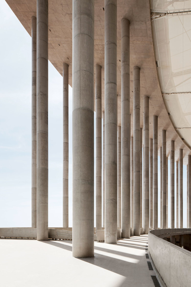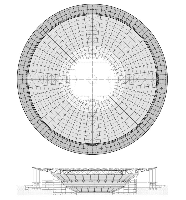 The reinforced concrete structure of the stadium roof comprises the Esplanade, the circle of columns that consists of 288 concrete pillars, as well as the concrete compression ring of the cable-net roof. The entire structure is based on a perfect circle based on 96 radial and 3 tangential ring axes of the concrete pillars. The 288 concrete pillars are up to 61m tall and with a diameter of 1.2 to 1.5m extremely slender. The 22 m wide tapered concrete compression ring has an outer diameter of 309m. The great tensile forces of the cable structure are anchored in the radial walls by means of strand- bundle cables.The suspended roof consists of a cable-net that features 48 radial cables. These connect the compression ring to the tension ring. On top of this are the slender radial and tangential truss girders which are continuously stabilized by the pin-jointed membrane arches.,The entire roof is wrapped into a PTFE fiberglass membrane.