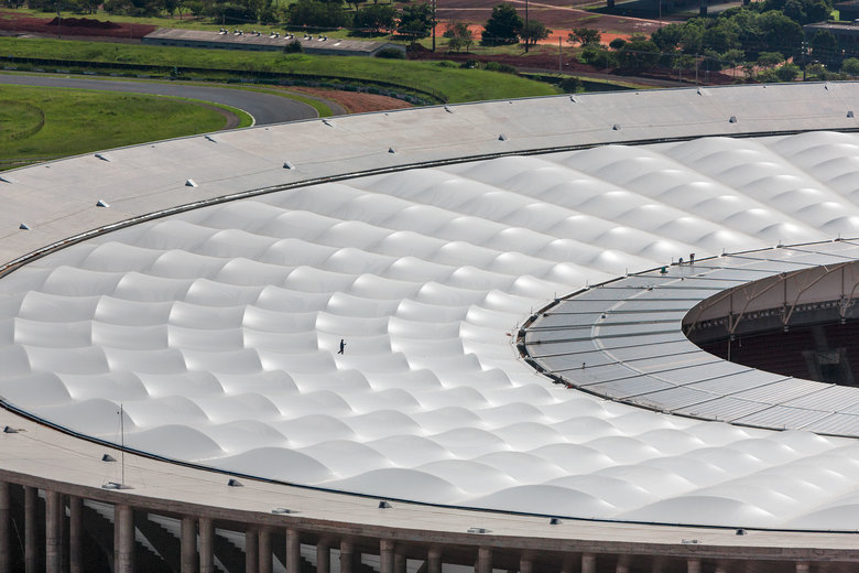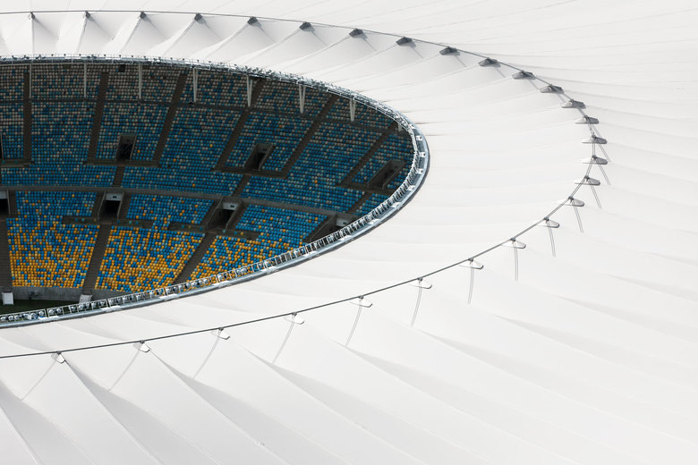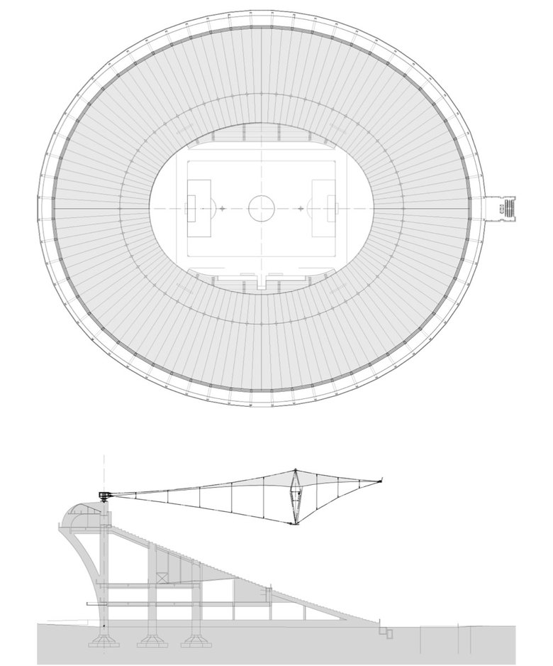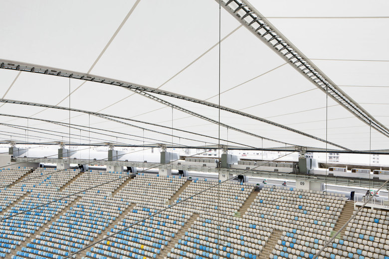 An analysis of the existing stadium structure revealed that the original cantilevered concrete roof had not only become inadequate in terms of its function, but it also lacked sufficient structural safety in the long run. Thus, the scheme includes the existing reinforced concrete columns of the old stadium bowl to support a new lightweight roof structure based on the principle of a horizontal spoked wheel. An innovative option of this system, which features one compression ring and three tension rings made of high-performance materials, facilitates an almost floating roof. Even in regard to sustainability, this solution beats all conventional roof structures. The spoke cables are tightened between the rim of the wheel, called compression ring in structural engineering, and the tension rings allocated at the inner edge of the roof. These are made of high-strength cables. The roof covering consists of a PTFE coated fiberglass membrane, suspended between the radial main axes. Additional radial filet cables stabilize the surface. At the height of the cable- supported props, these filet cables are suspended towards the lower tension ring, and thus generate a minimal turning point which serves as water drainage. This way, the membrane sections attain their characteristic, gracefully curved deltoid shape. The attraction of the scheme derives from the extremely slender inner and outer edge. This emphasizes the deliberately cautious and considerate intervention into the existing structure. Therefore, Rio de Janeiro’s icon has not been significantly changed, but it was rather transformed into a modern landmark to enter a new era. This has been achieved by emphasizing the striking radial structure of the old, as well as of the new structure with its filigree, translucent lightweight cable roof.